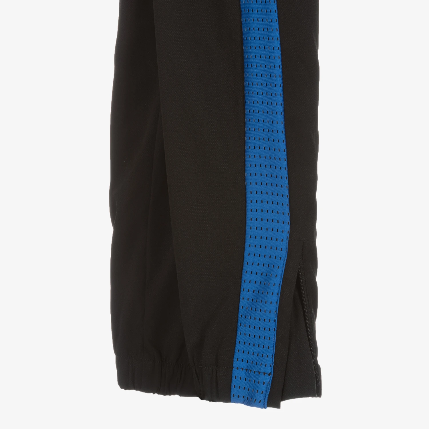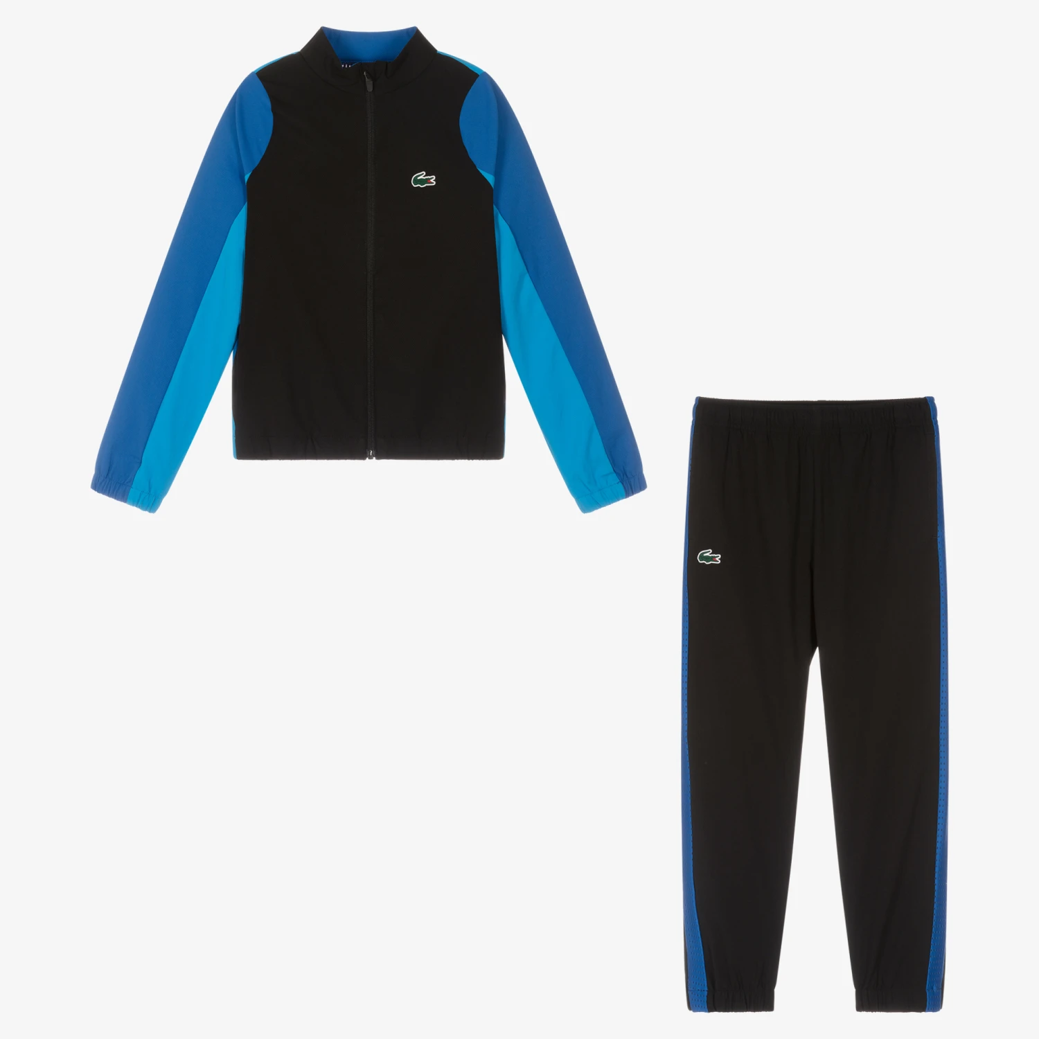 Sleek and sporty, a black tracksuit for teen boys from Lacoste, with cool bright blue trims. Both items have a rubberised crocodile logo, whilst the zip-up top has a bold box logo print on the back. There are zipped pockets on the top to keep essentials securely stored, with elasticated trims for comfort. It pairs conveniently with the matching joggers, which have an internal drawstring waist, pockets, and zip-up ankles. This tracksuit is made from a smooth and lightweight fabric, with mesh trims for breathability.