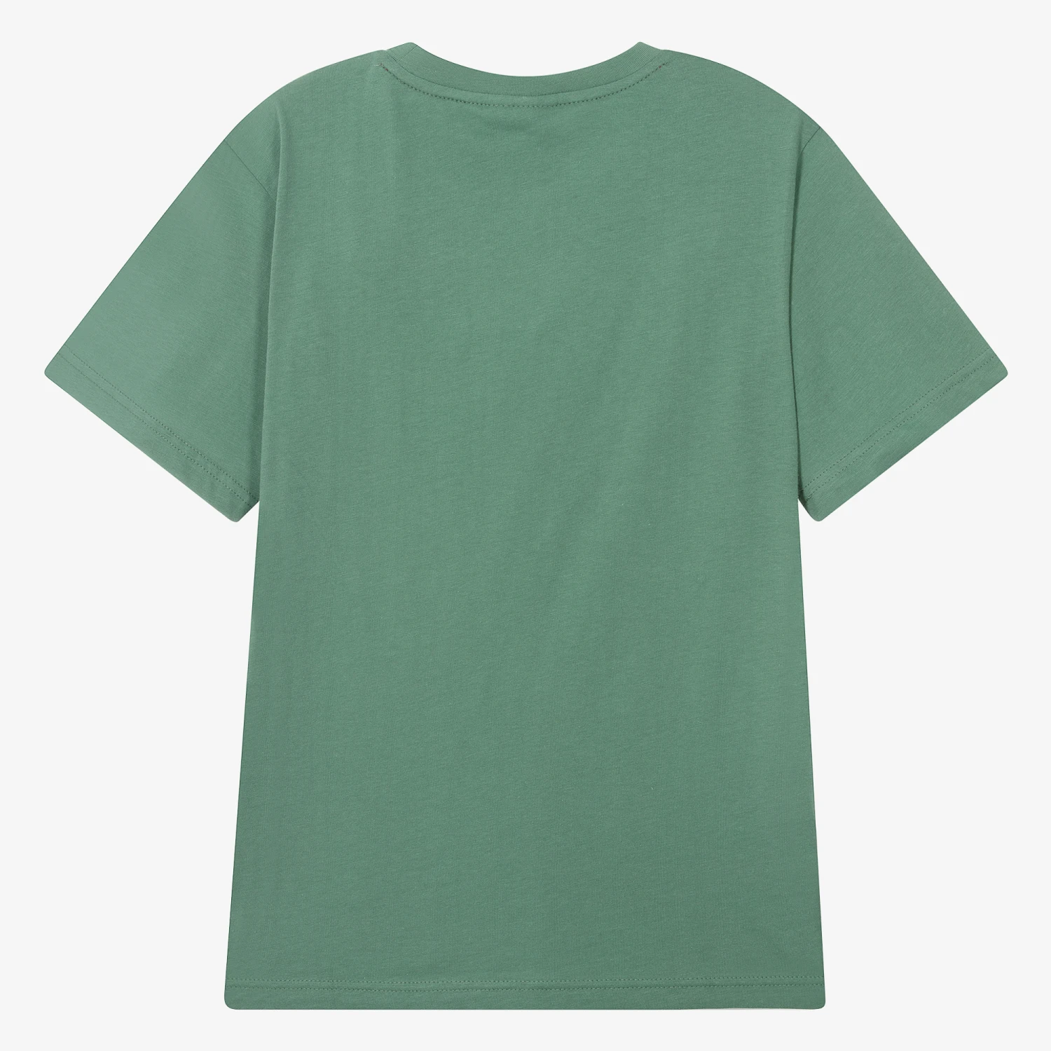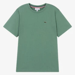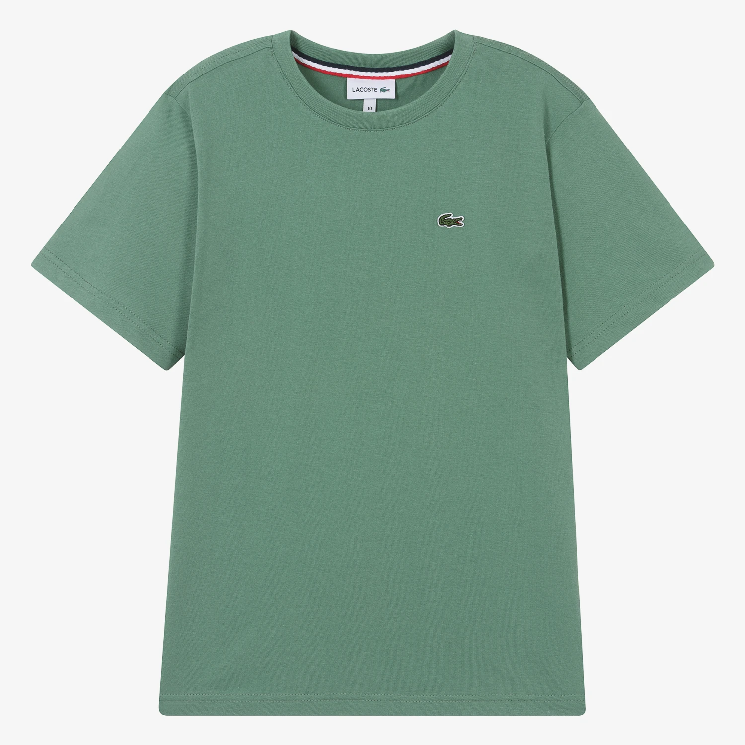 Khaki green T-shirt for teen boys by Lacoste, with the brand’s signature crocodile logo patch on the chest. This casual crew neck tee is made in soft and comfortable cotton jersey.