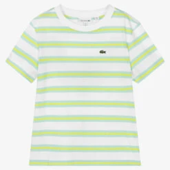 An essential white T-shirt for teen boys by Lacoste, with a green crocodile logo sewn on the chest to add a distinctive touch. In a mint green and vibrant yellow stripe, this casual tee is made in soft cotton jersey with a gently ribbed crew neck.