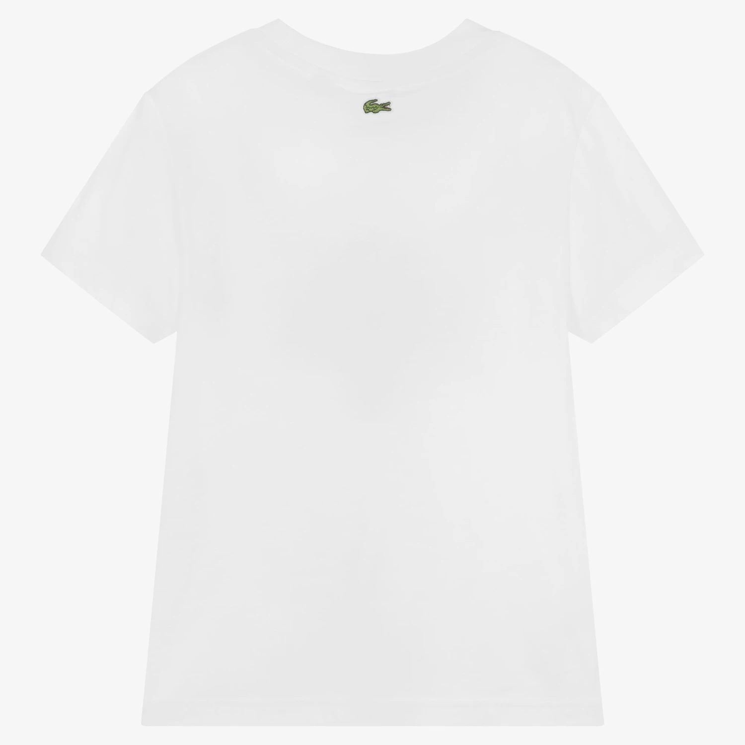 White T-shirt for teen boys by Lacoste, with a racing-themed logo print on the front that incorporates the iconic crocodile. As seen in the adult collection, this casual cotton tee has short sleeves, a classic crew neckline and a green crocodile patch on the back.