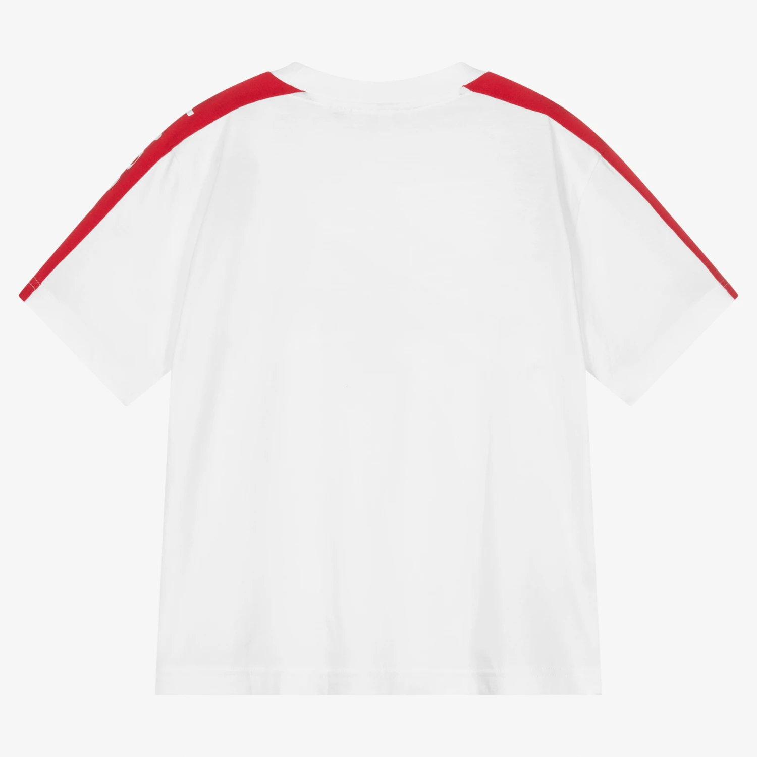 A casual white, cotton jersey T-shirt for teen boys by French brand Lacoste. It has a red and white logo panel on the shoulders and the designer’s iconic crocodile logo embroidered in green on the chest.