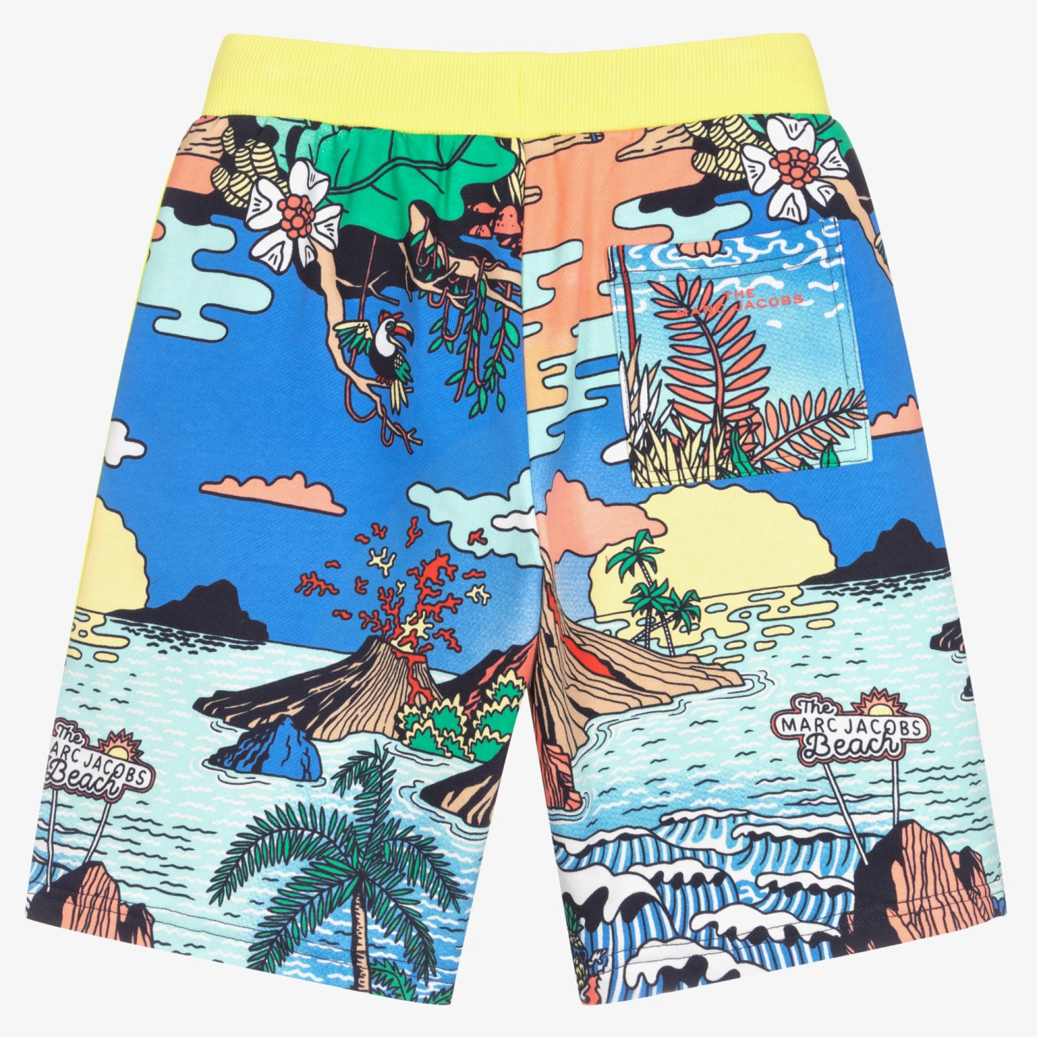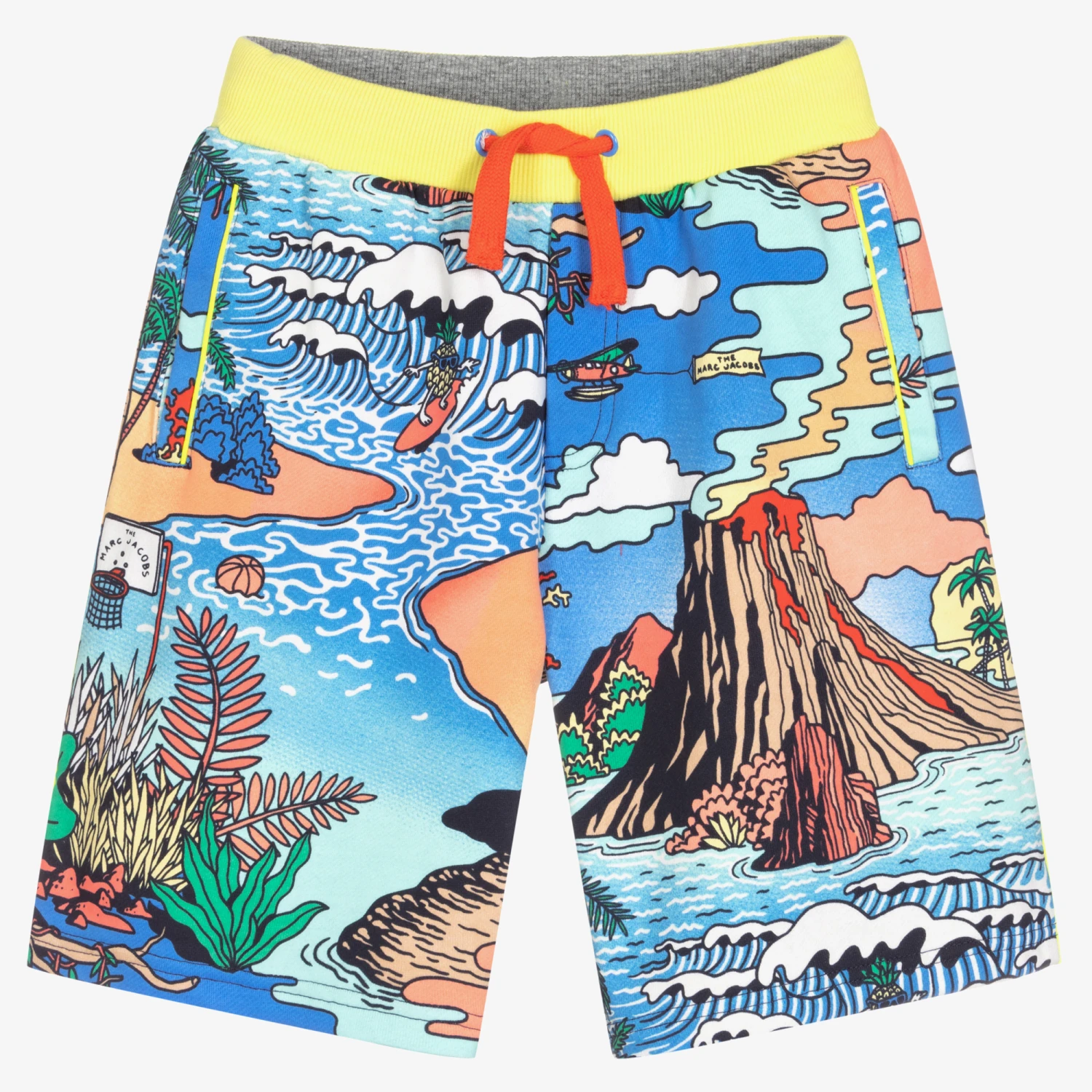Bold blue cotton jersey shorts for teen boys by American brand THE MARC JACOBS, made in soft mid-weight cotton jersey. Bright and colourful, they have an all-over Hawaiian pattern, with subtle logo motifs and a red logo print on the back pocket. There are neon yellow trims throughout and a bright yellow drawstring waistband.