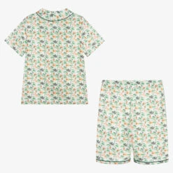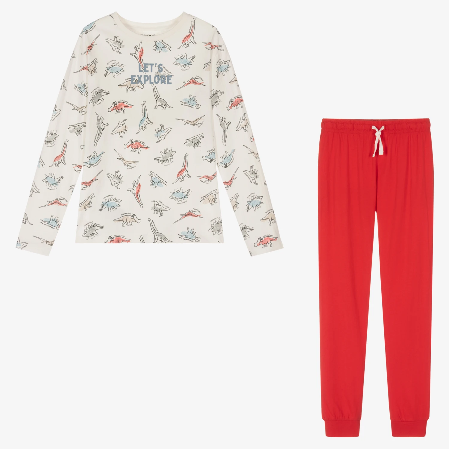 Cool for lounging, these ivory and red pyjamas for teen boys are from Mayoral. The long-sleeved top is patterned in dinosaurs, with ‘Let’s Explore’ printed on the front. The trousers have an adjustable waist with elasticated cuffs, offering a great fit. Both items are made from soft sustainable cotton jersey for utmost comfort.
