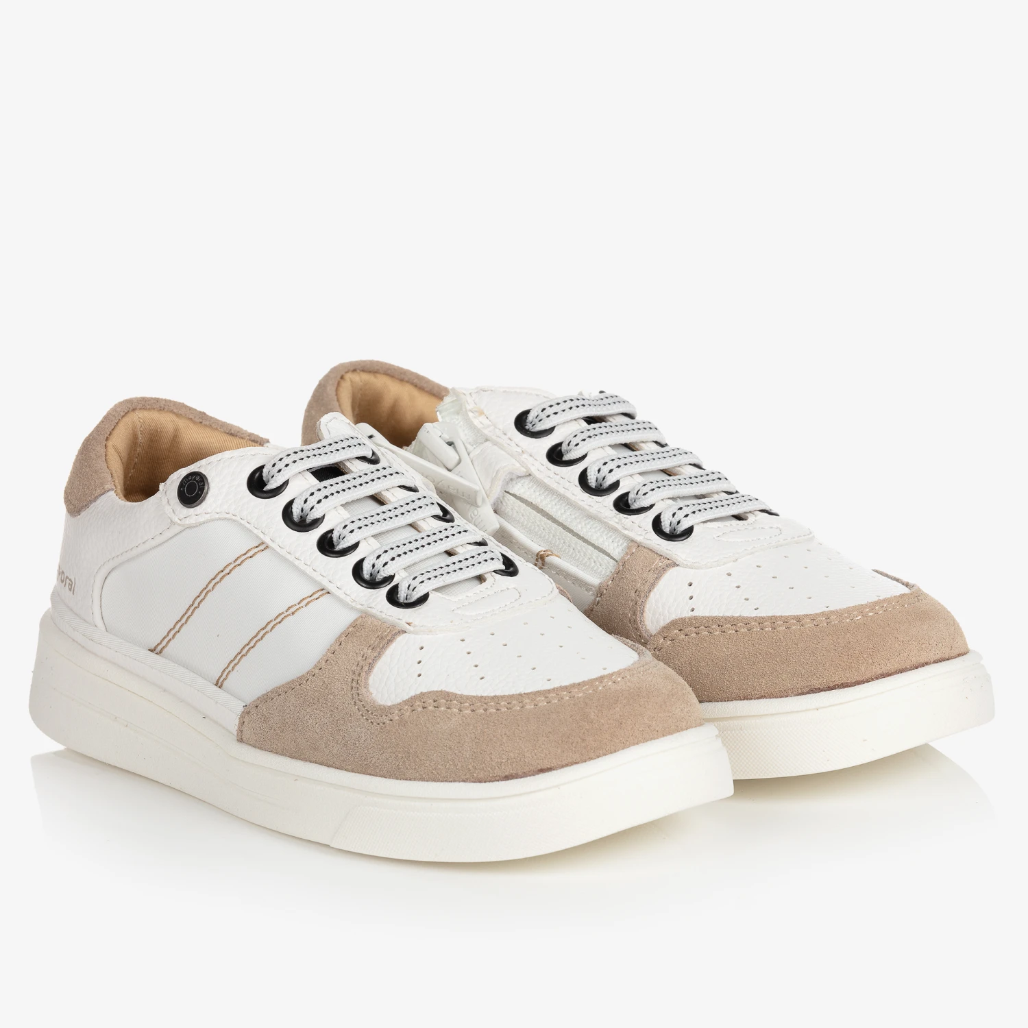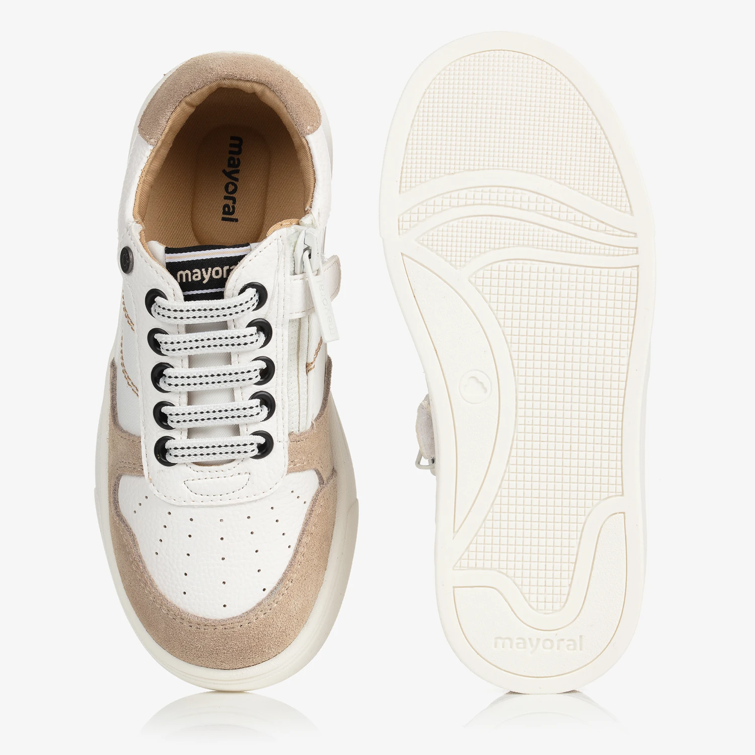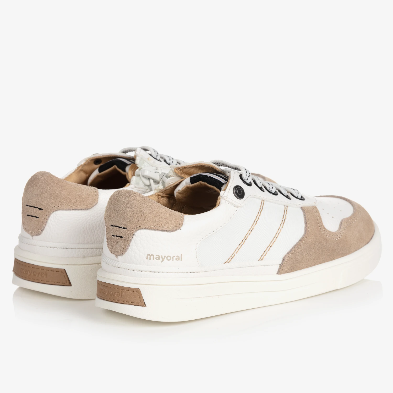 Teen boys white trainers with beige suede trims from Mayoral, made from real and faux leather with nylon canvas side panels. With a cotton canvas lining, the removable insole is breathable, moisture-absorbing and cushioned for all-day comfort. They have black and white elasticated laces with side zip and logo branded non-slip sole.