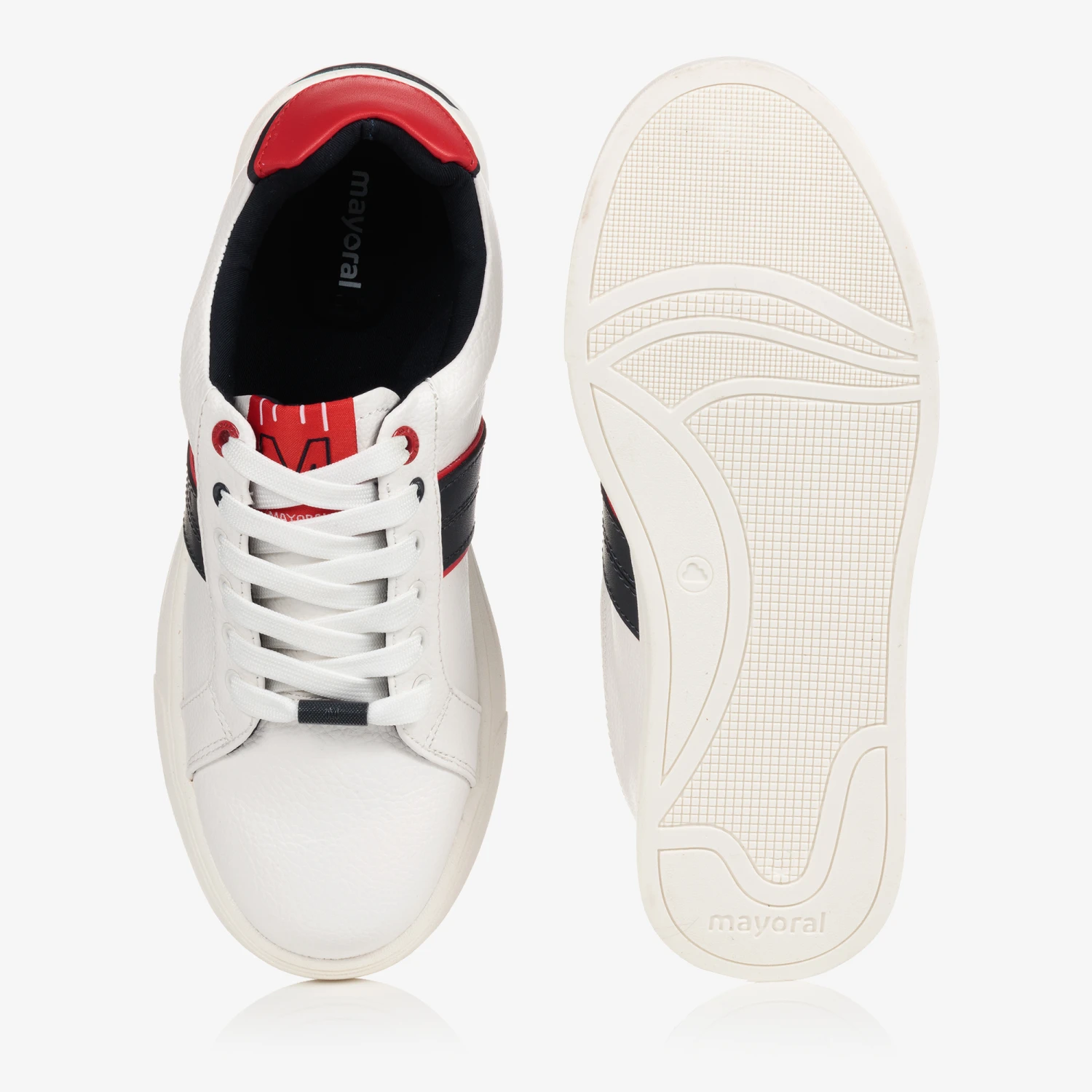 Teen boys white grained faux leather trainers with navy blue and red trims by Mayoral. With cotton canvas lining, the removable insole is breathable, moisture-absorbing and cushioned for all-day comfort. Logo branded across the design and fun with interchangeable laces, they come with an extra pair of navy blue laces.