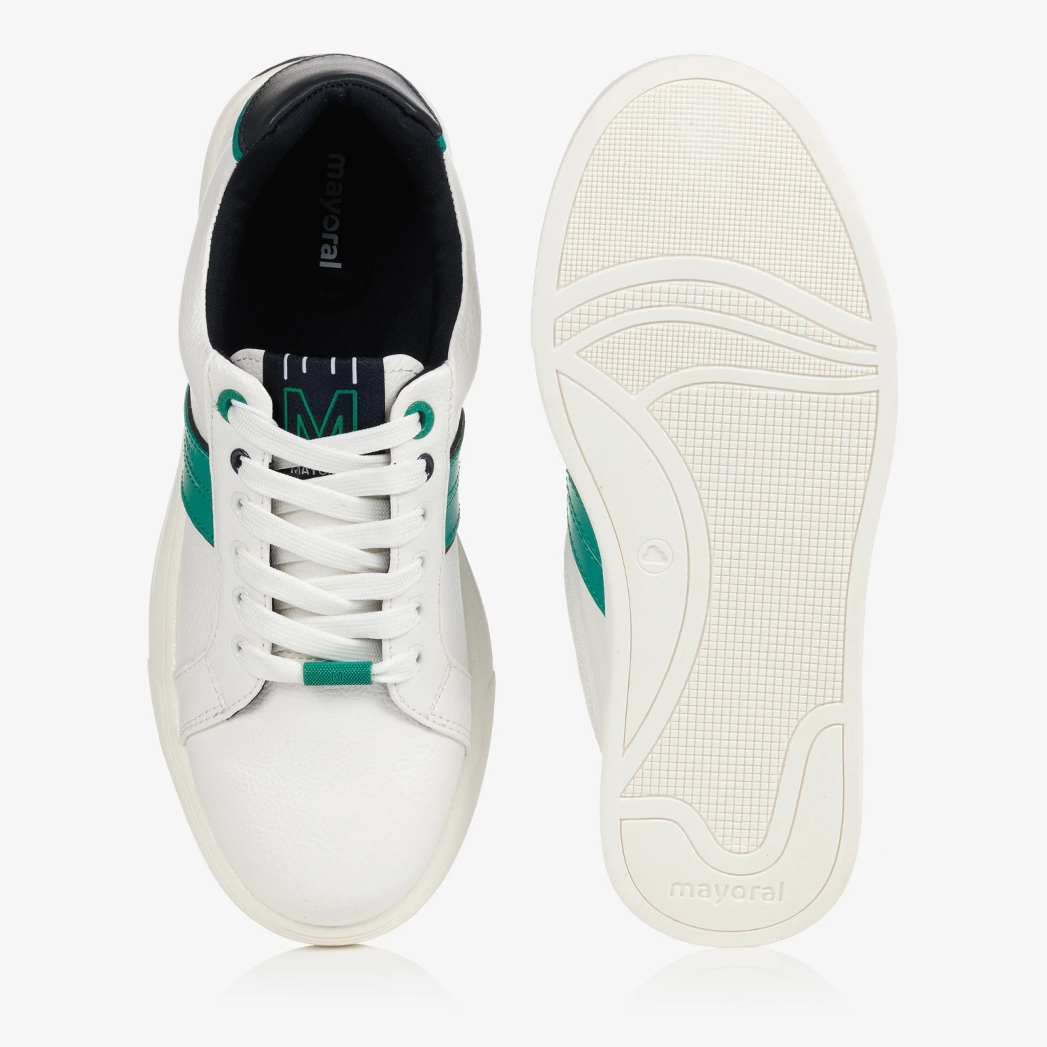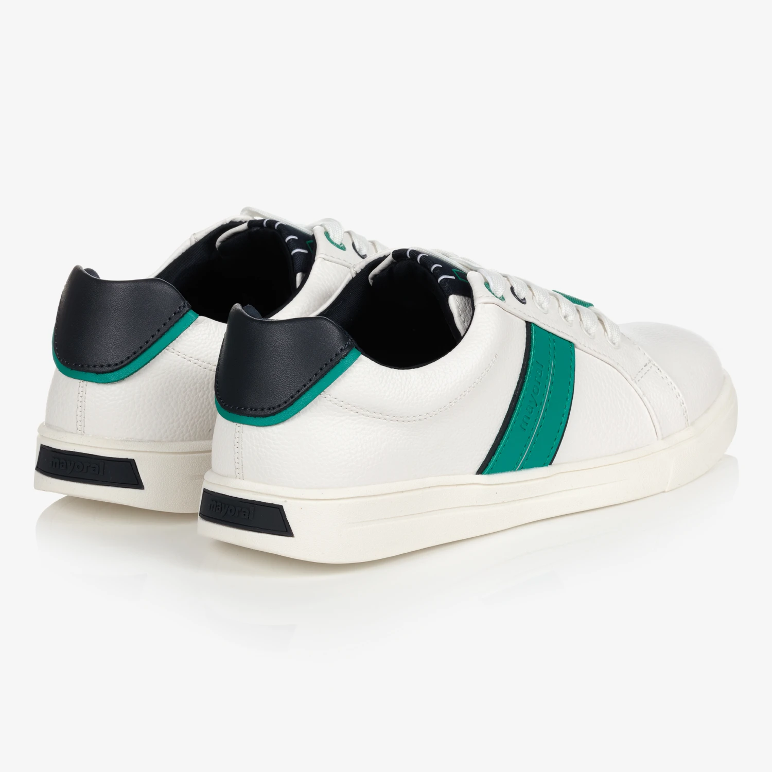 Teen boys white grained faux leather trainers with green and navy blue trims by Mayoral. With cotton canvas lining, the removable insole is breathable, moisture-absorbing and cushioned for all-day comfort. Logo branded across the design and fun with interchangeable laces, they come with an extra pair of navy blue laces.