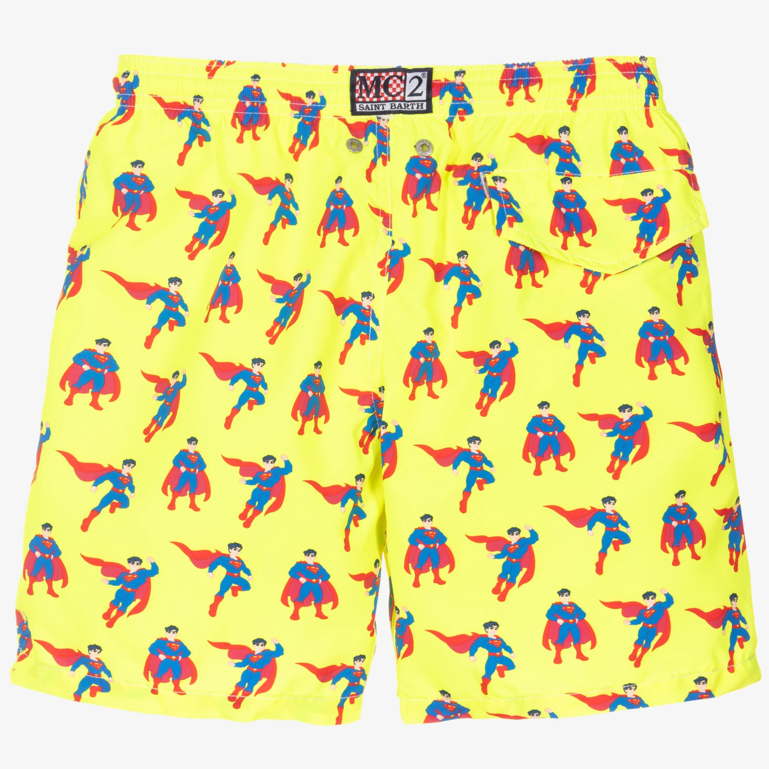 Teen boys neon yellow swim shorts by MC2 Saint Barth, patterned with a red and blue Superman™ print. They are made in recycled polyester with soft mesh lining and an elasticated drawstring waist. There are three pockets and the shorts are packable into the back pocket, fastening with a magnetic closure.