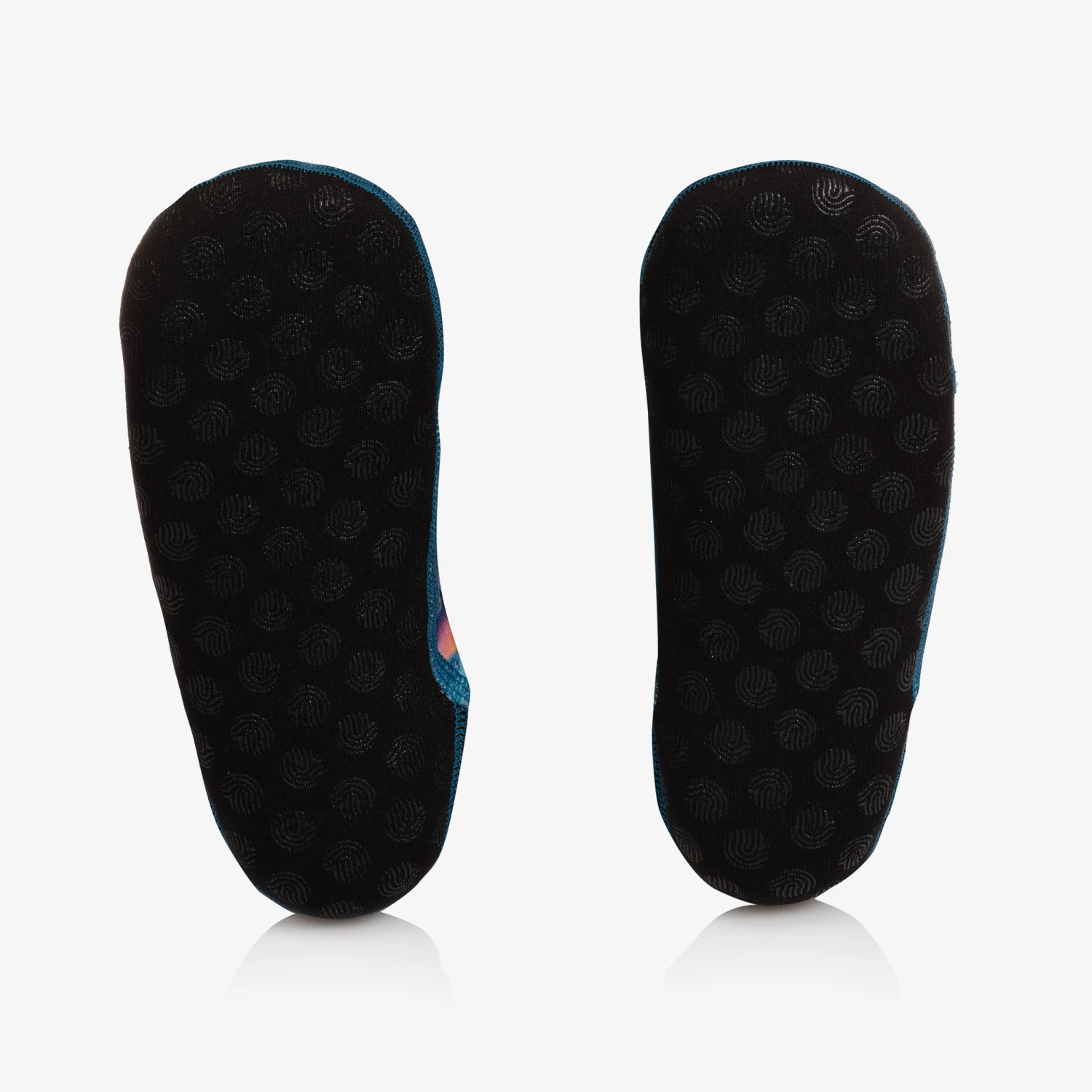Teen boys blue and black aqua shoes by Molo, with a lovely ocean-themed print. They are made from soft and stretchy recycled polyester, with non-slip soles.