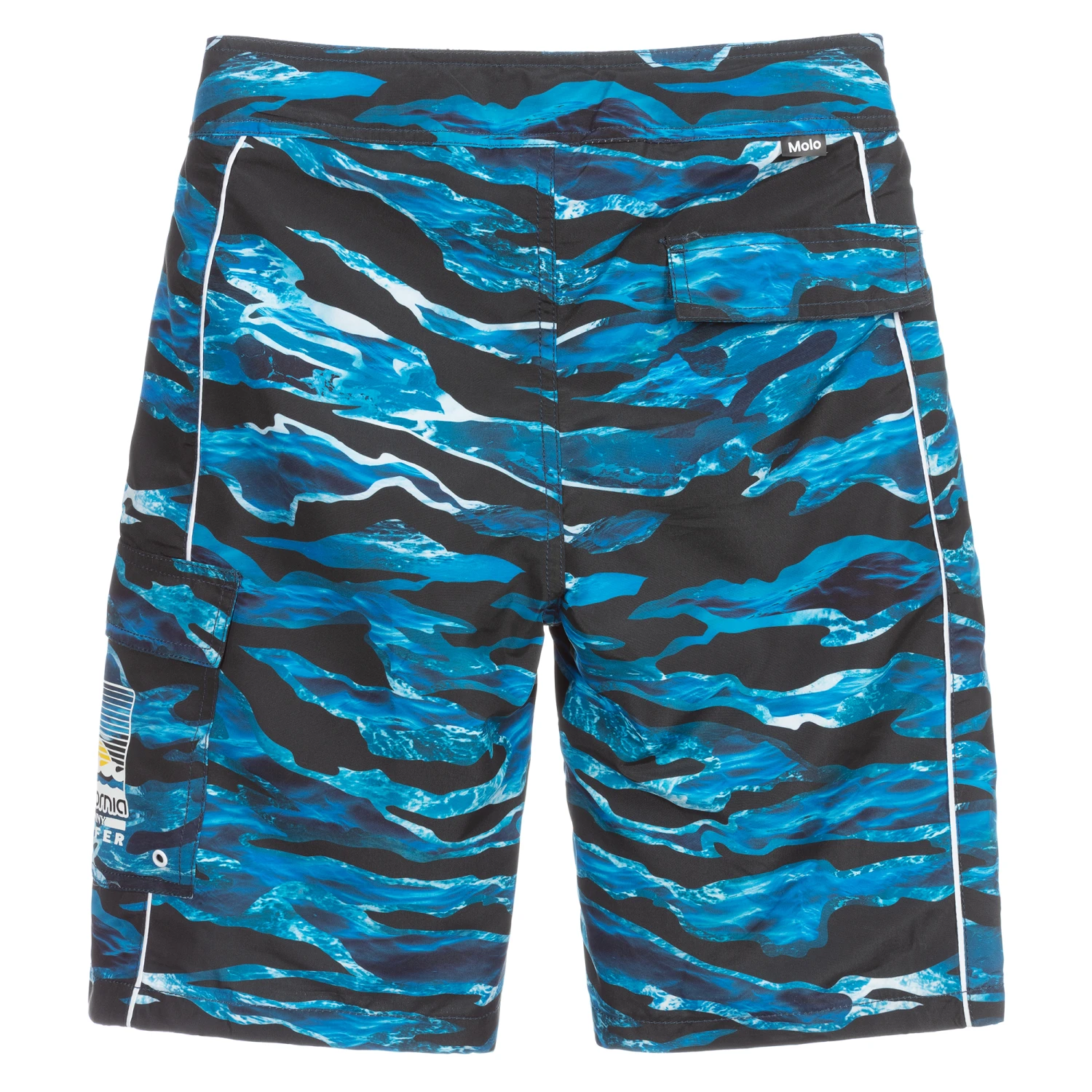 Teen boys blue and black swim shorts with white trims by Molo, made from recycled polyester. They have a velcro fastening waistband, mesh lining and pockets on the sides. There is a white ‘Hawaii surfer’ print on the leg.