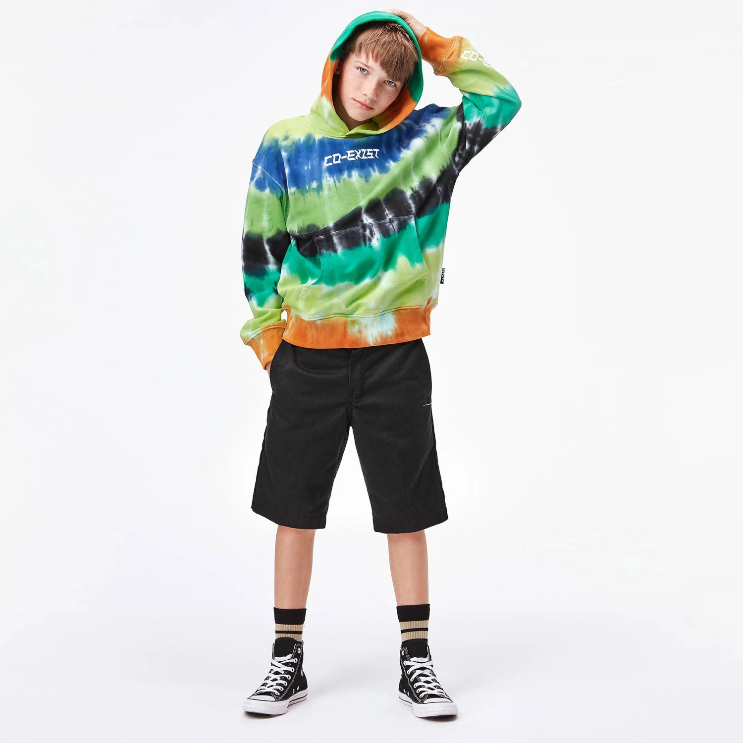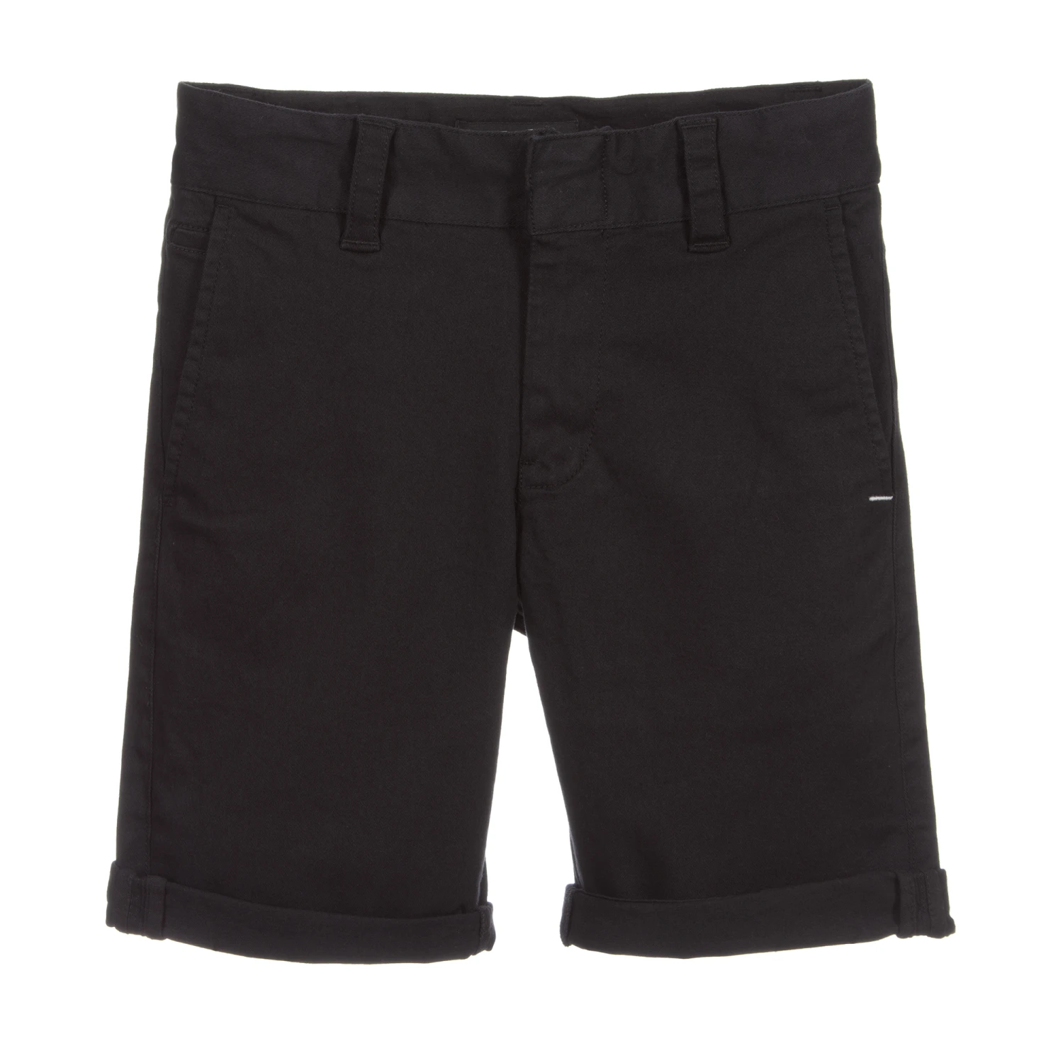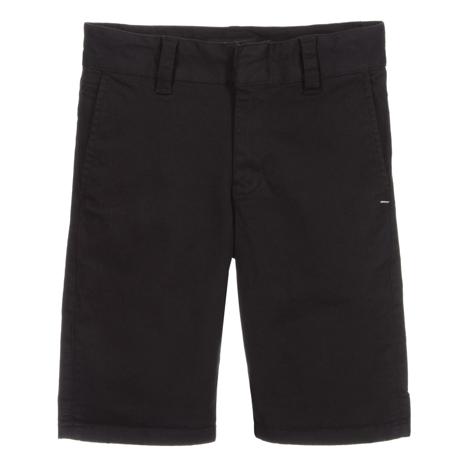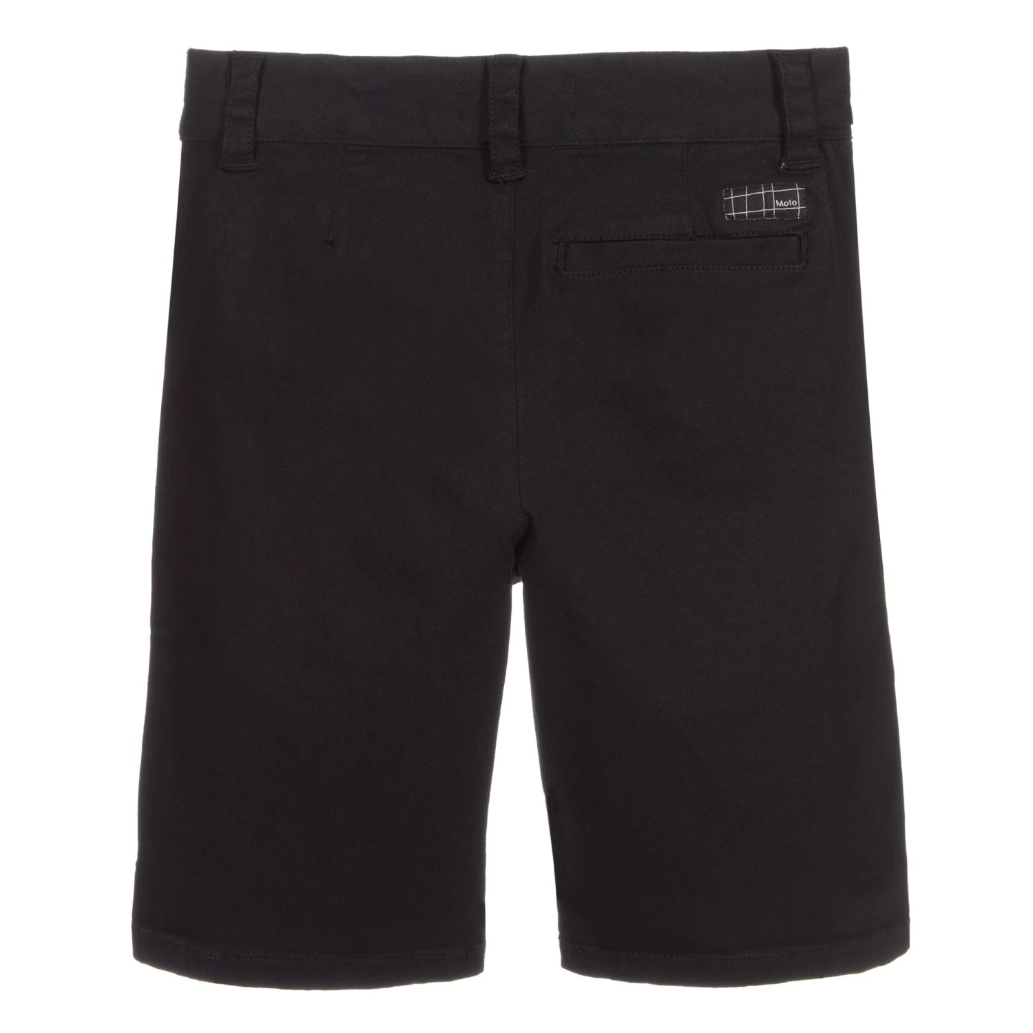 Classic black chino shorts for teens boys by Molo. They are made in stretchy twill for comfort and the waist can be adjusted for a good fit. These smart shorts can be worn with the hems turned up for a more relaxed look.