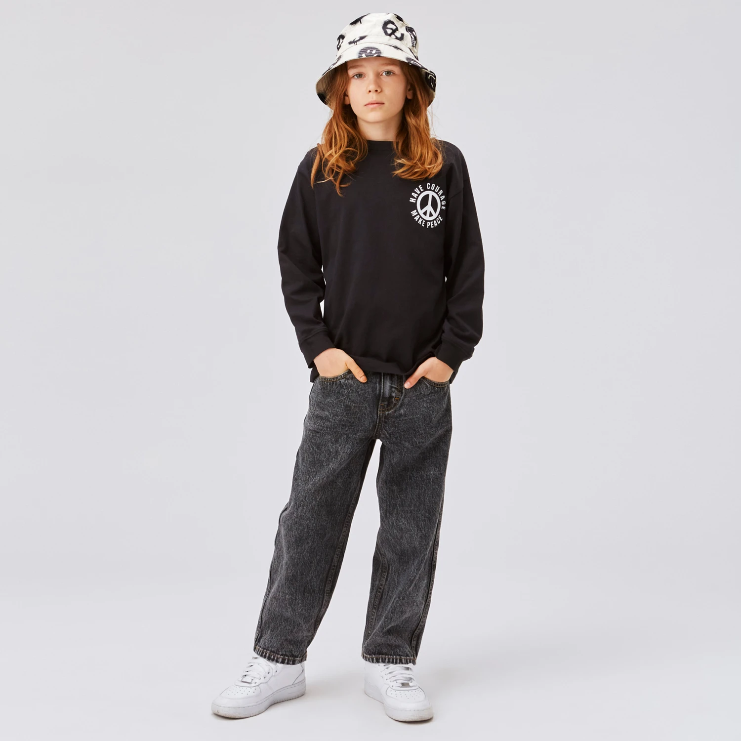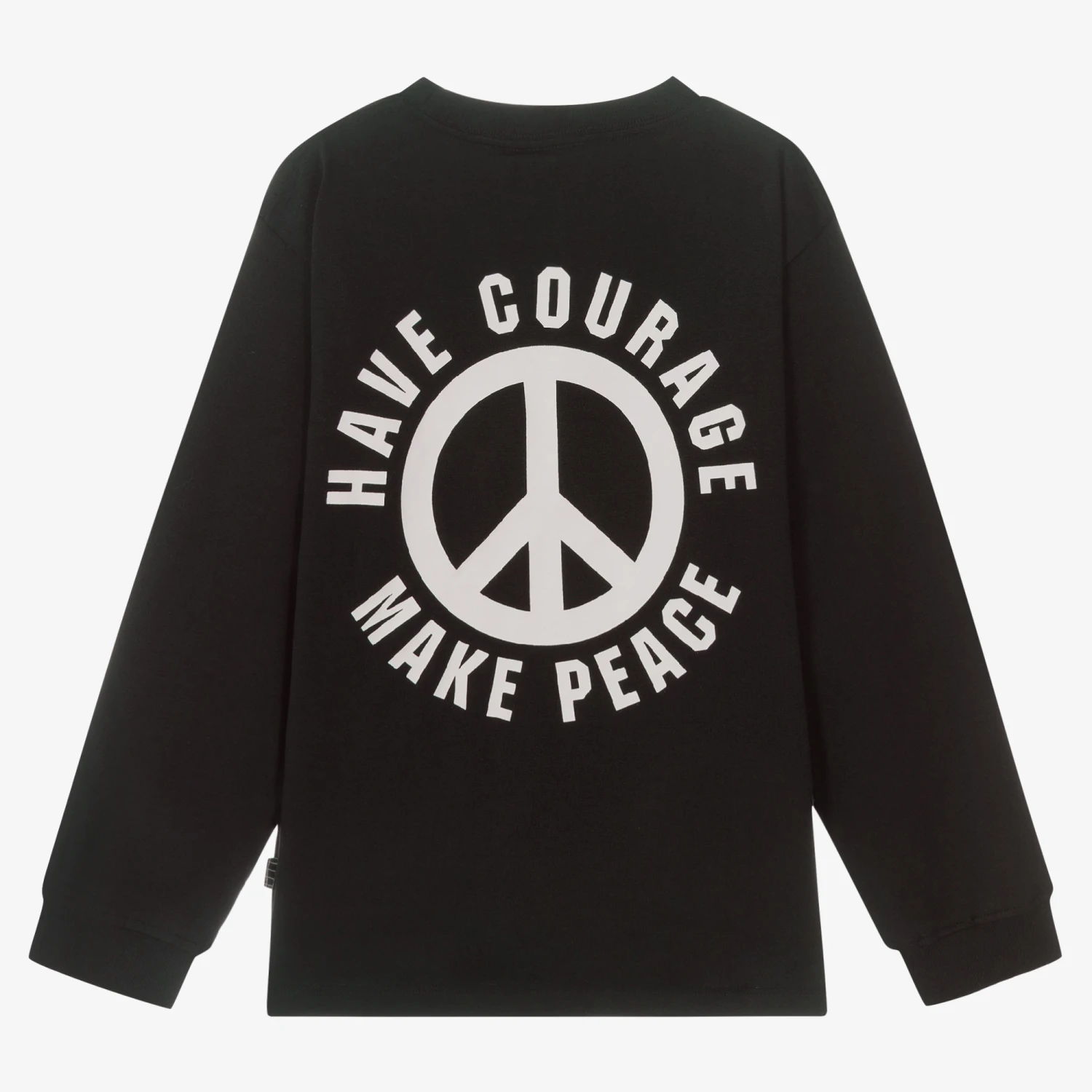 Teen boys black top by Molo, with a contrast white print on the chest incorporating a ‘Have courage, make peace’ slogan, centred around the peace symbol. With a matching print on the back, this casual piece is made from soft organic cotton jersey for comfortable, casual wear. It is finished with long sleeves, a classic crew neck, and narrow ribbed cuffs.Â