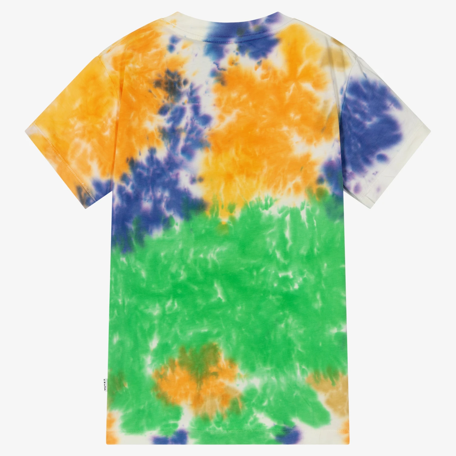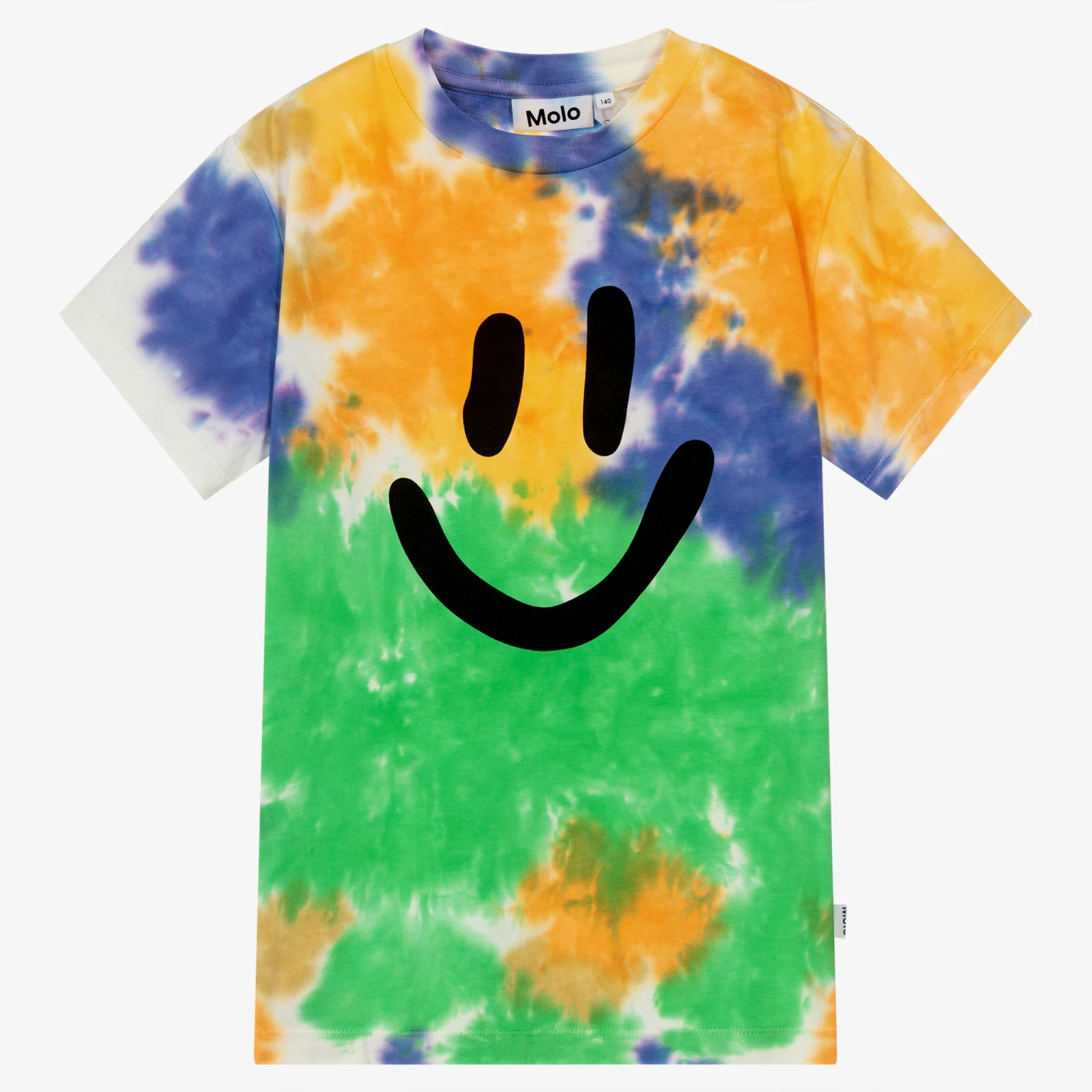 Cool and colourful, this green, orange and blue T-shirt for teen boys and girls is from Molo. In a fun tie-dye design, it is printed with a black happy face graphic for a positive vibe. Made in the softest organic cotton jersey, this top is casually styled with a subtle logo tab on the side.