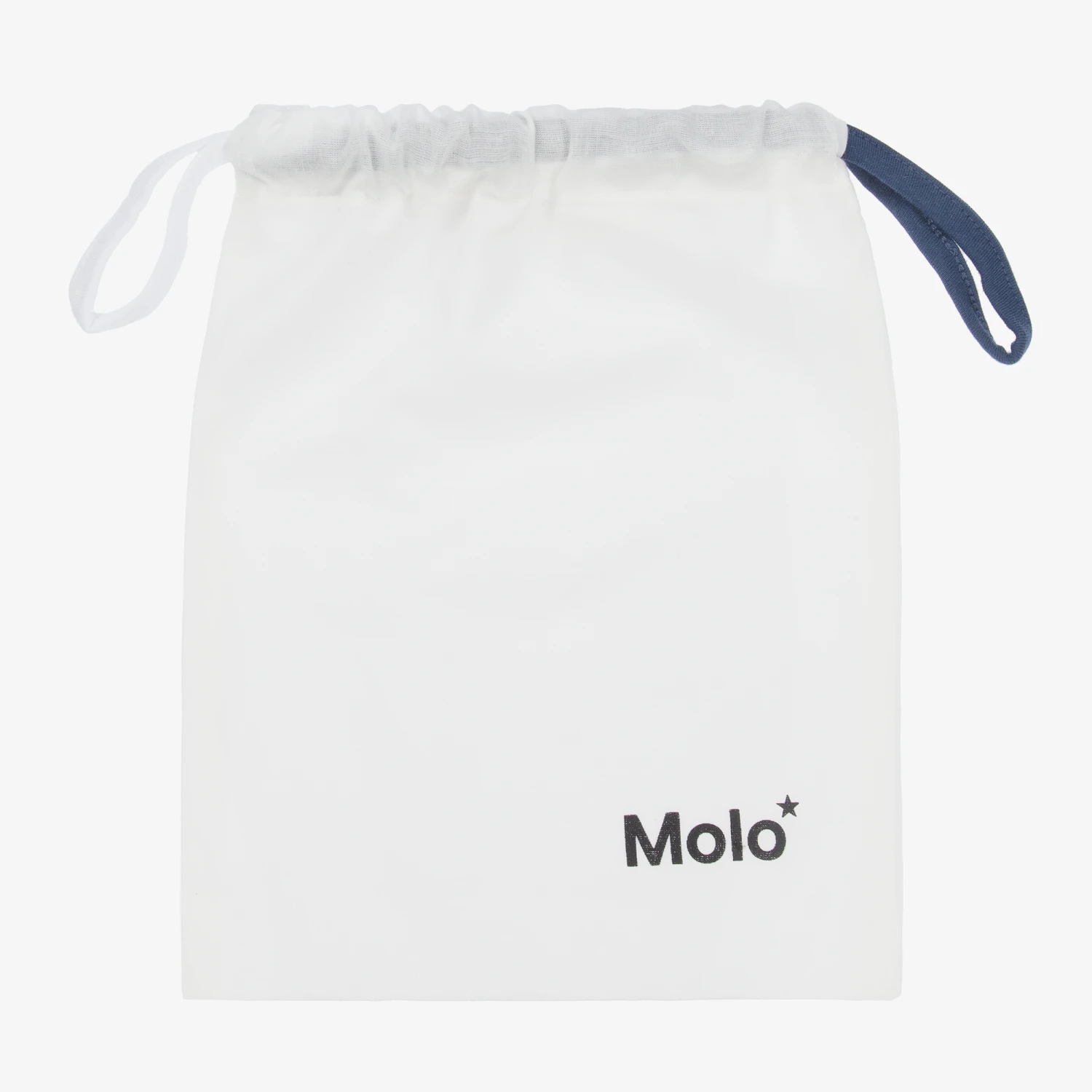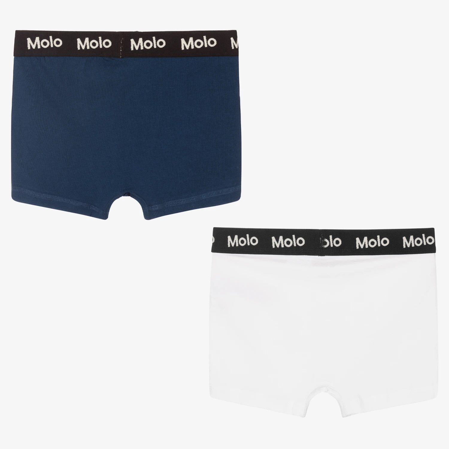 Two pack of white and navy blue boxers for teen boys, by Danish brand Molo, made from soft organic cotton jersey. They have a black and white elasticated logo waistband for comfort.