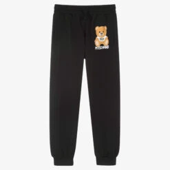 Stylish black cotton jersey joggers for teen boys and girls by Italian designer Moschino Kid-Teen. The instantly recognisable Moschino Teddy Bear logo is printed on the front, giving this staple piece a quirky finish. The elasticated waist has an adjustable drawstring for a better fit and the ankles are cuffed for a laid-back look.