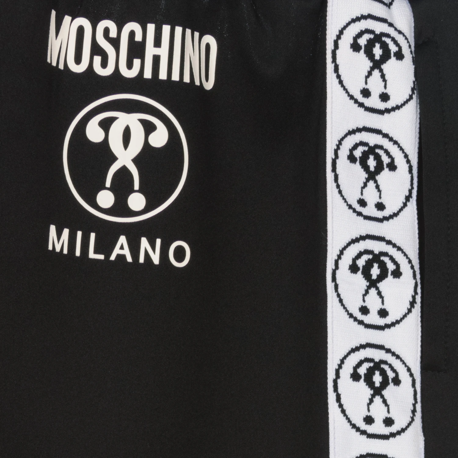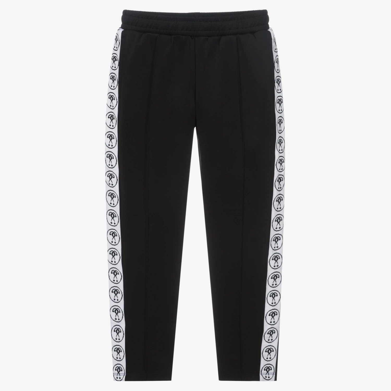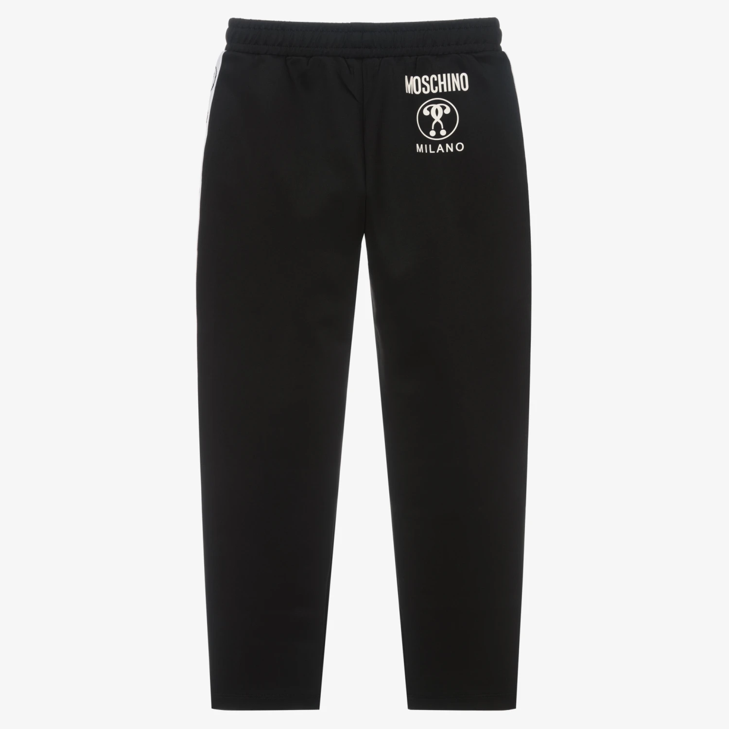 Casual black joggers for teen boys and girls, by Moschino Kid-Teen, with white Double Question Mark logo stripes on the sides of each leg. As seen in the main collection, they are made in silky sports jersey, and have a useful internal drawstring waist, ensuring comfort and style.