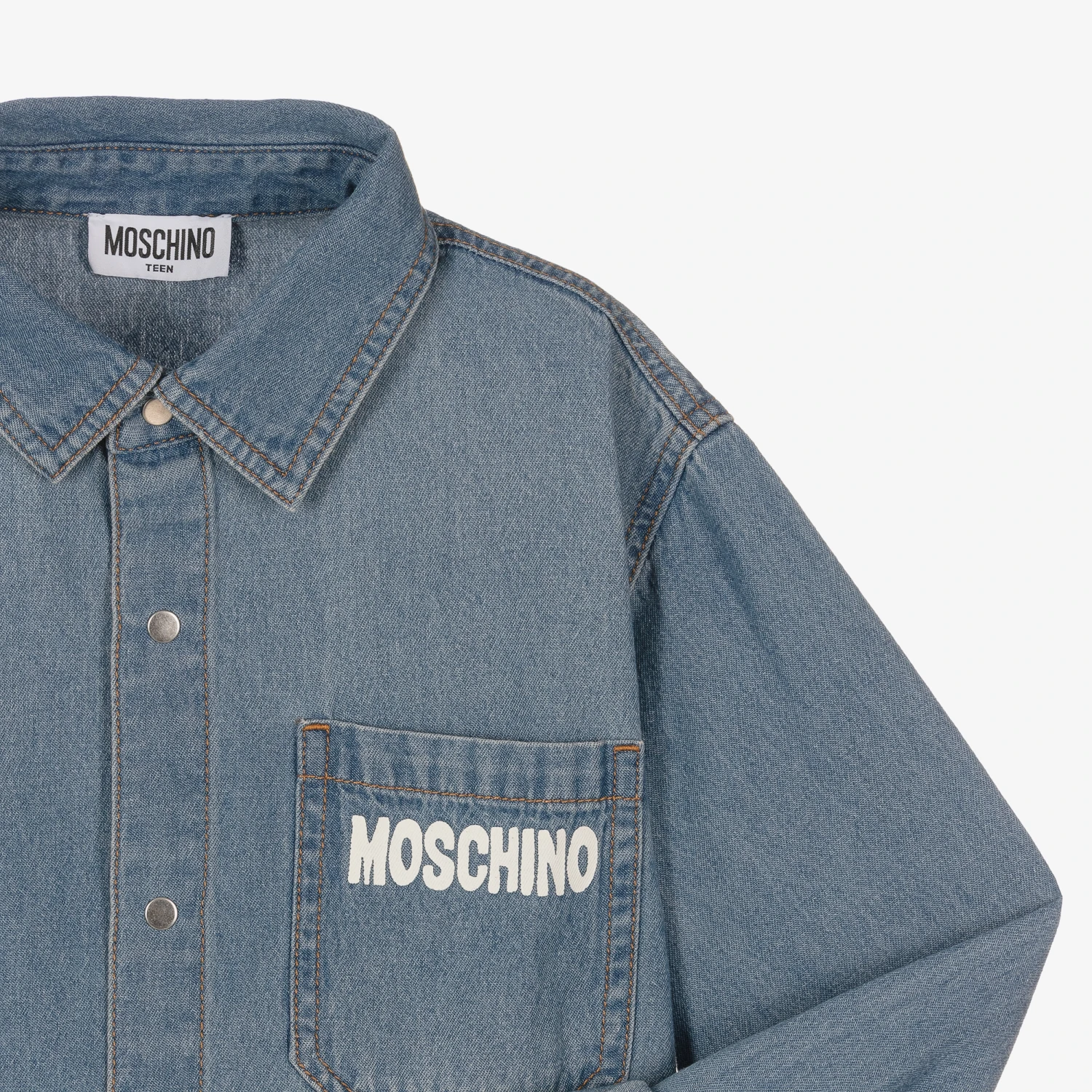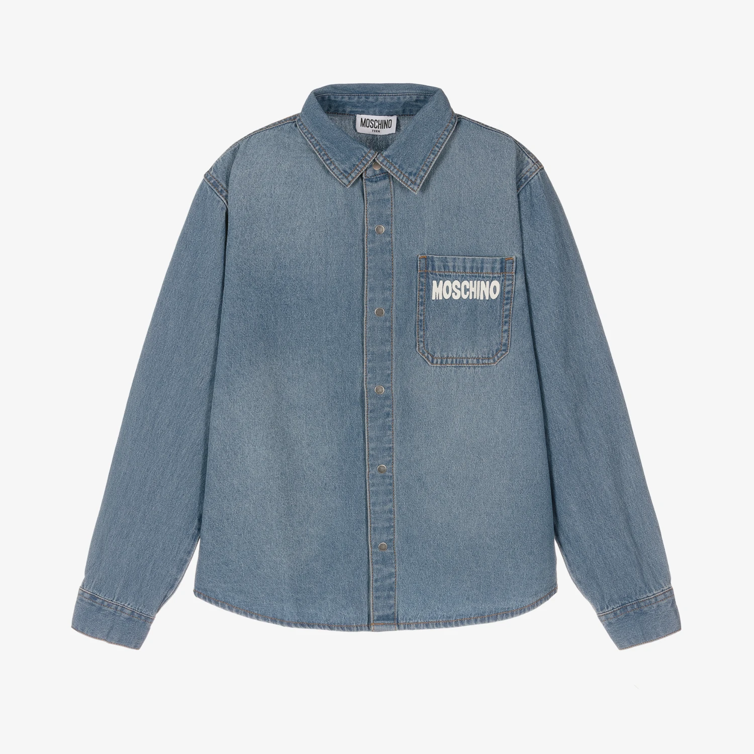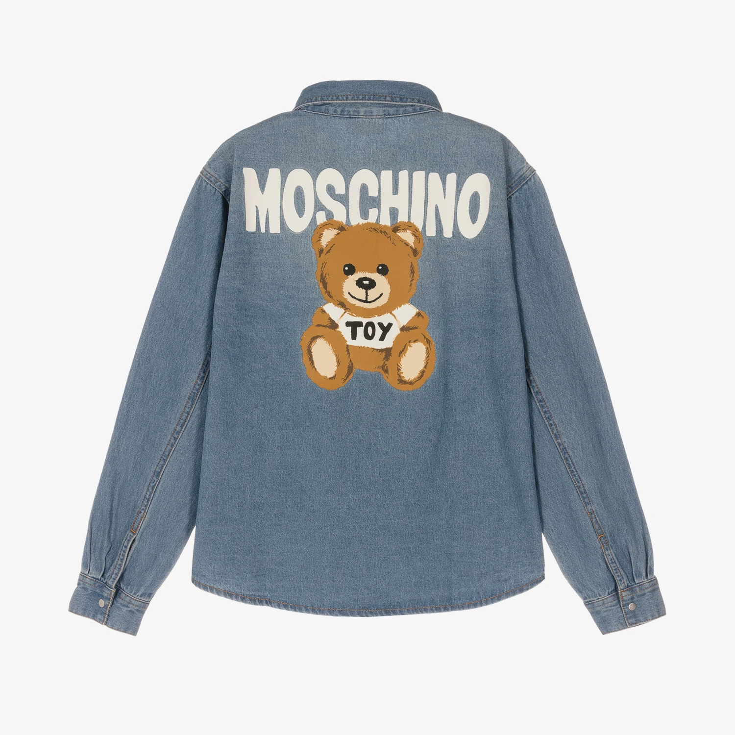 Blue denim shirt for teen boys and girls by Moschino Kid-Teen, with an oversized Moschino Teddy Bear logo on the back. Made in comfortable cotton, this timeless piece has a pointed collar, silver metal popper fastenings and barrelled cuffs. Classic in style, the patch pocket on the front is finished with signature branding.
