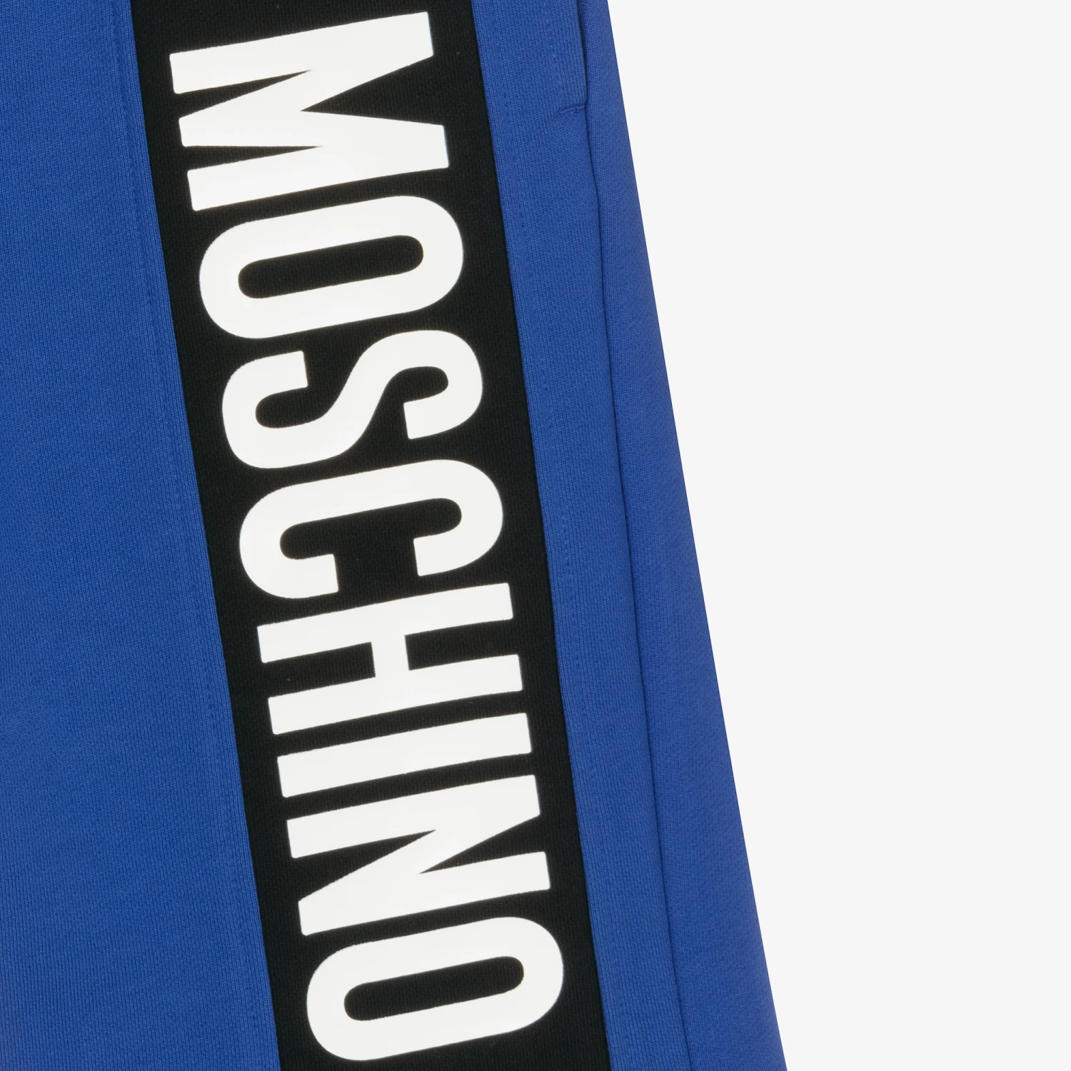 Casual cobalt blue shorts for teen boys by luxury designer Moschino Kid-Teen, made in soft cotton sweatshirt jersey. Inspired by the menswear collection, one of the legs has a multicolour flocked logo print. Comfortable to wear, they have an elasticated drawstring waist and side pockets.