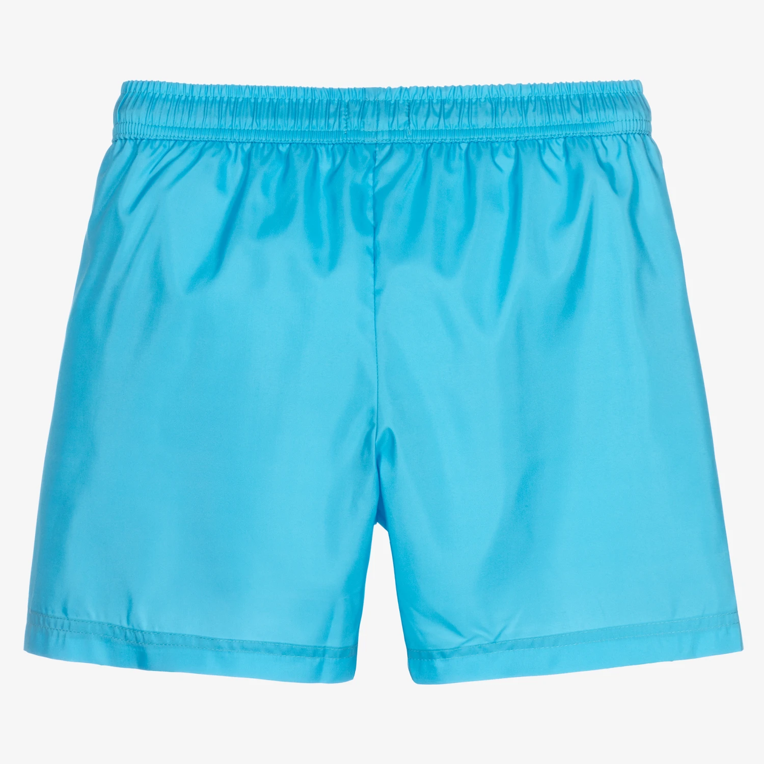 Bright blue swim shorts for teen boys by luxury designer Moschino Kid-Teen. Soft and lightweight, they have the Moschino Teddy Bear logo with sunglasses on one leg and a drawstring on the elasticated waist. There is a soft, fine mesh pants lining for comfort.