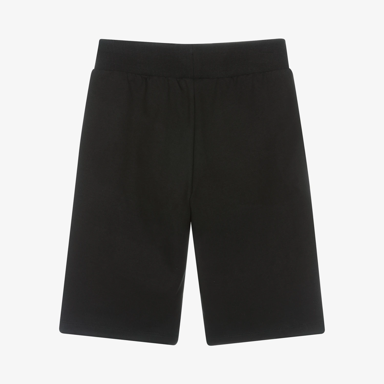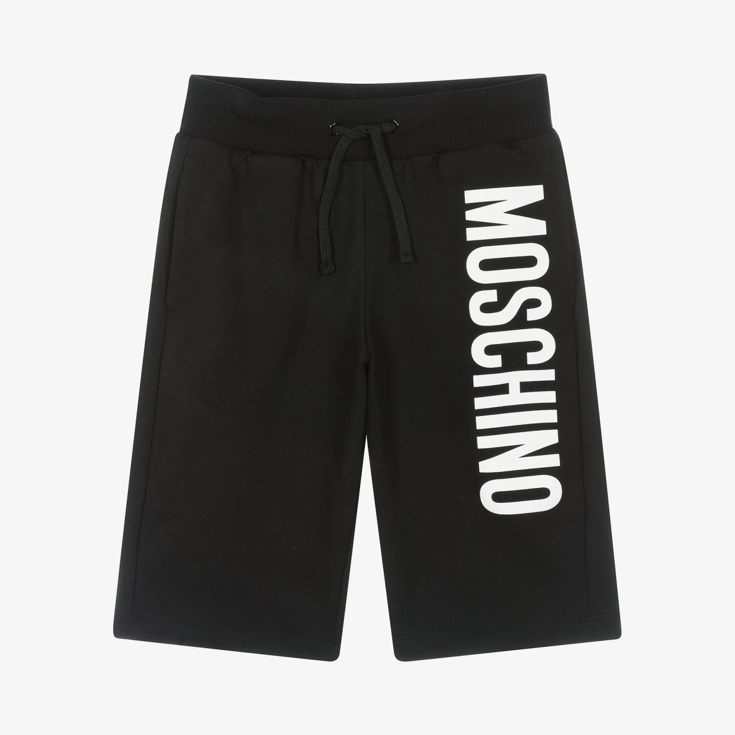 Black shorts for teen boys by Moschino Kid-Teen, made in soft cotton jersey with a bold white logo print on one leg. Great for days spent lounging, these comfortable shorts have side seam pockets and a ribbed drawstring waist.
