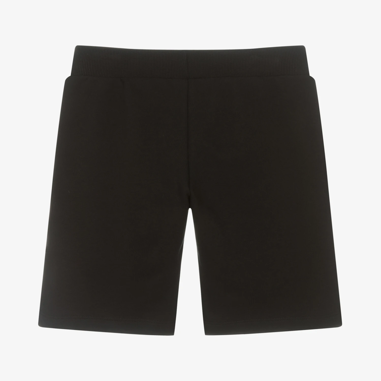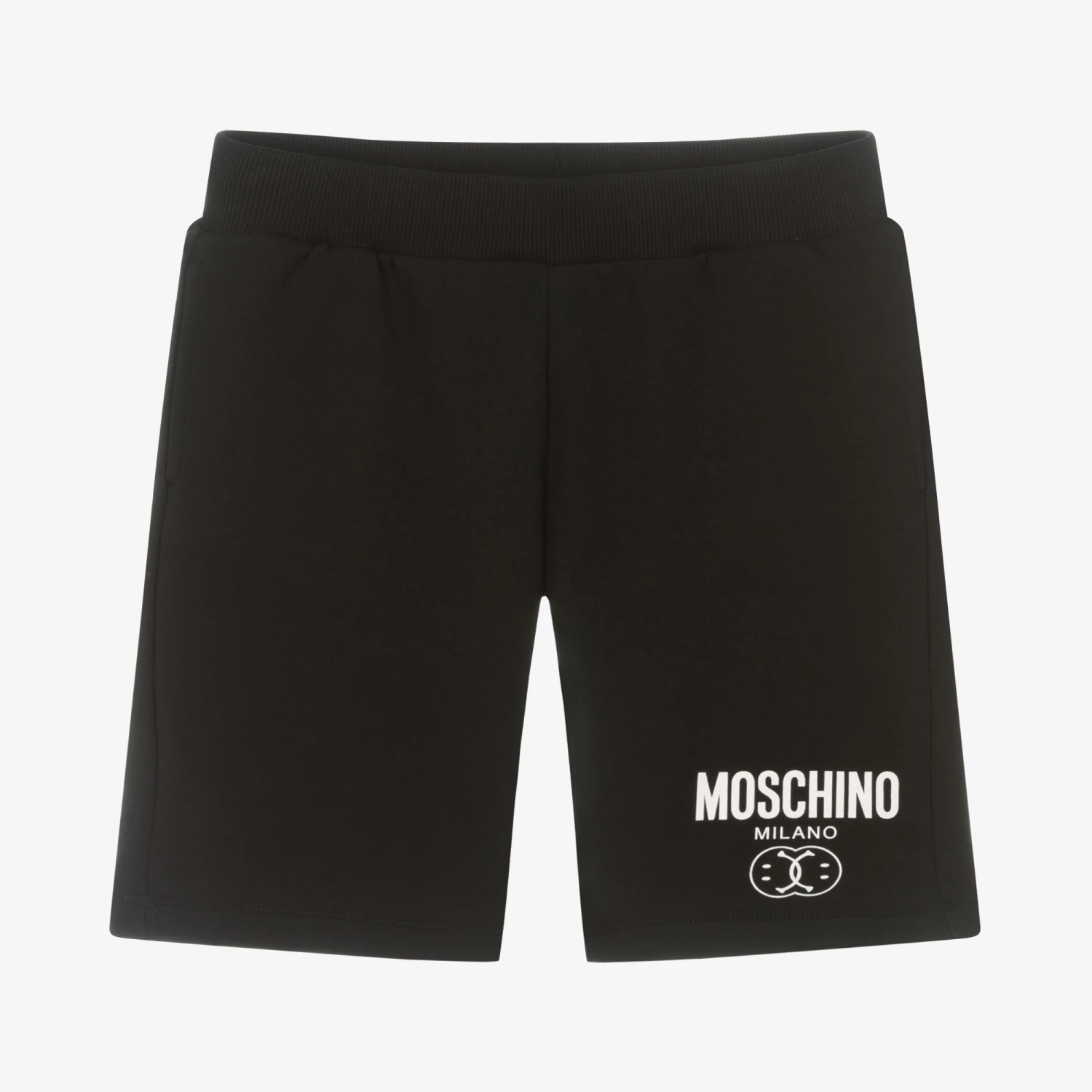 Black shorts for teen boys by Moschino Kid-Teen, with a white Double Smiley logo print on one leg. As seen in the main collection, they have side seam pockets and an internal drawstring waistband. Comfortable and easy to wear, these Bermuda-length shorts are made in mid-weight cotton sweatshirt jersey.