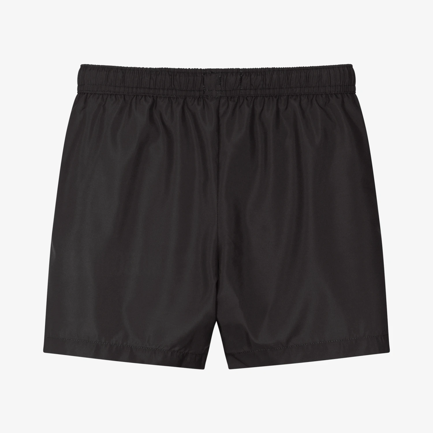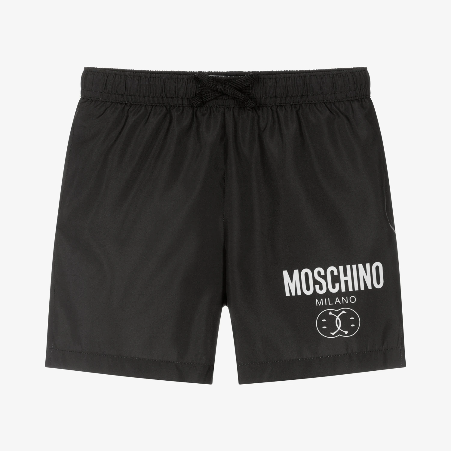 Cool black swim shorts for teen boys by Moschino Kid-Teen, with a white Double Smiley logo print on one leg, as seen in the main collection. Silky smooth and lightweight they have a mesh lining for comfort, side seam pockets and a drawstring waist.