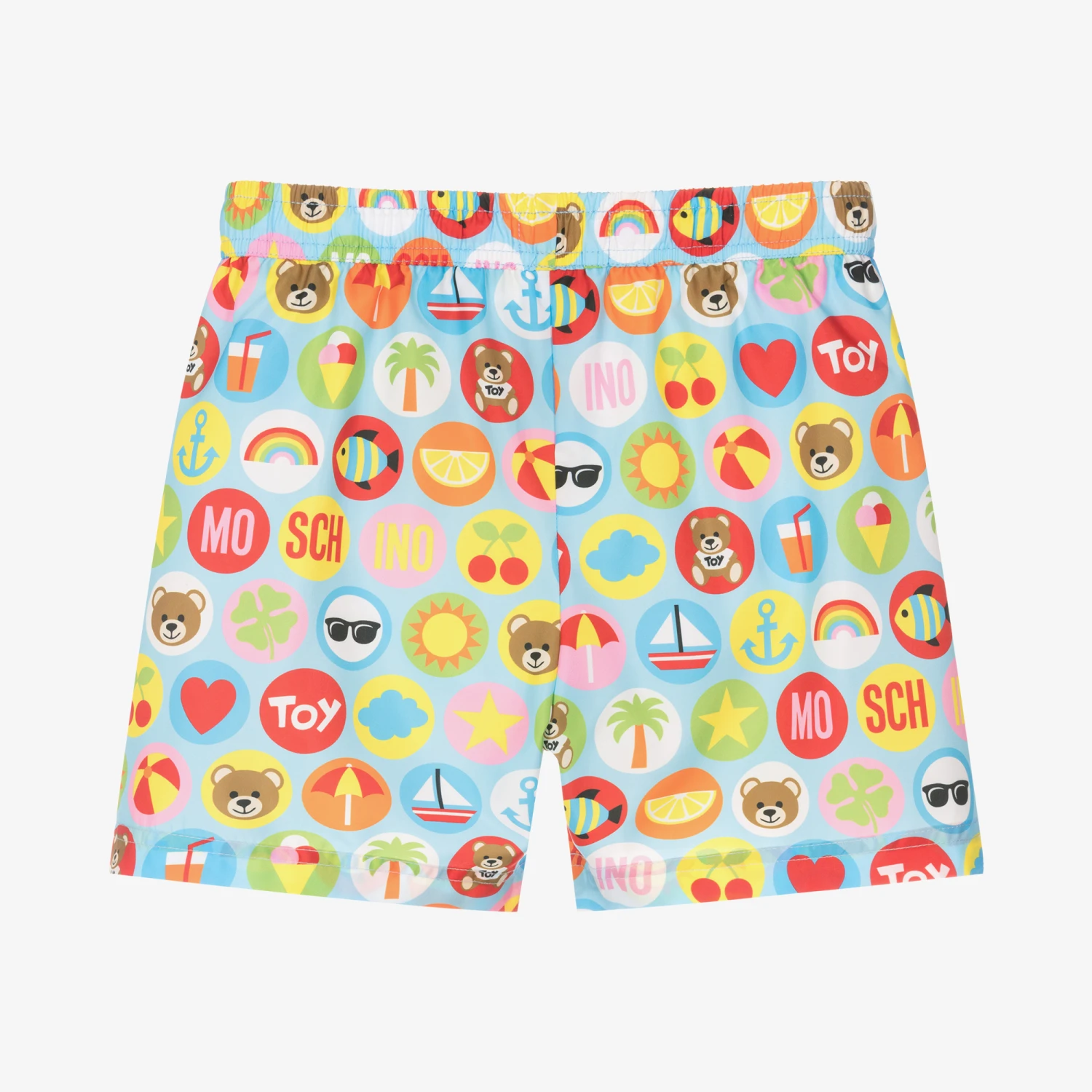 Light blue swim shorts for teen boys by Moschino Kid-Teen, patterned with colourful patches containing logos, Moschino Teddy Bears and beach-themed motifs. Silky smooth and lightweight they have a mesh lining for comfort and a useful drawstring waist.