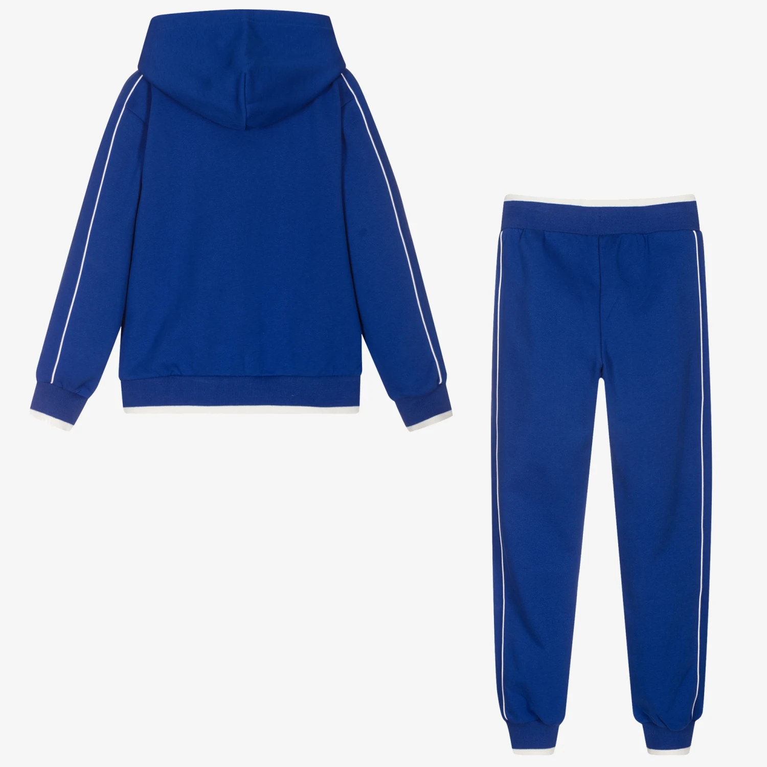 Teen boys blue tracksuit by luxury brand Moschino Kid-Teen, made with mid-weight cotton jersey. Both pieces have a raised basketball Moschino Teddy Bear logo print and white trims. The hooded top has front pouch pockets and a branded front zip fastening, and the joggers have a drawstring waist.