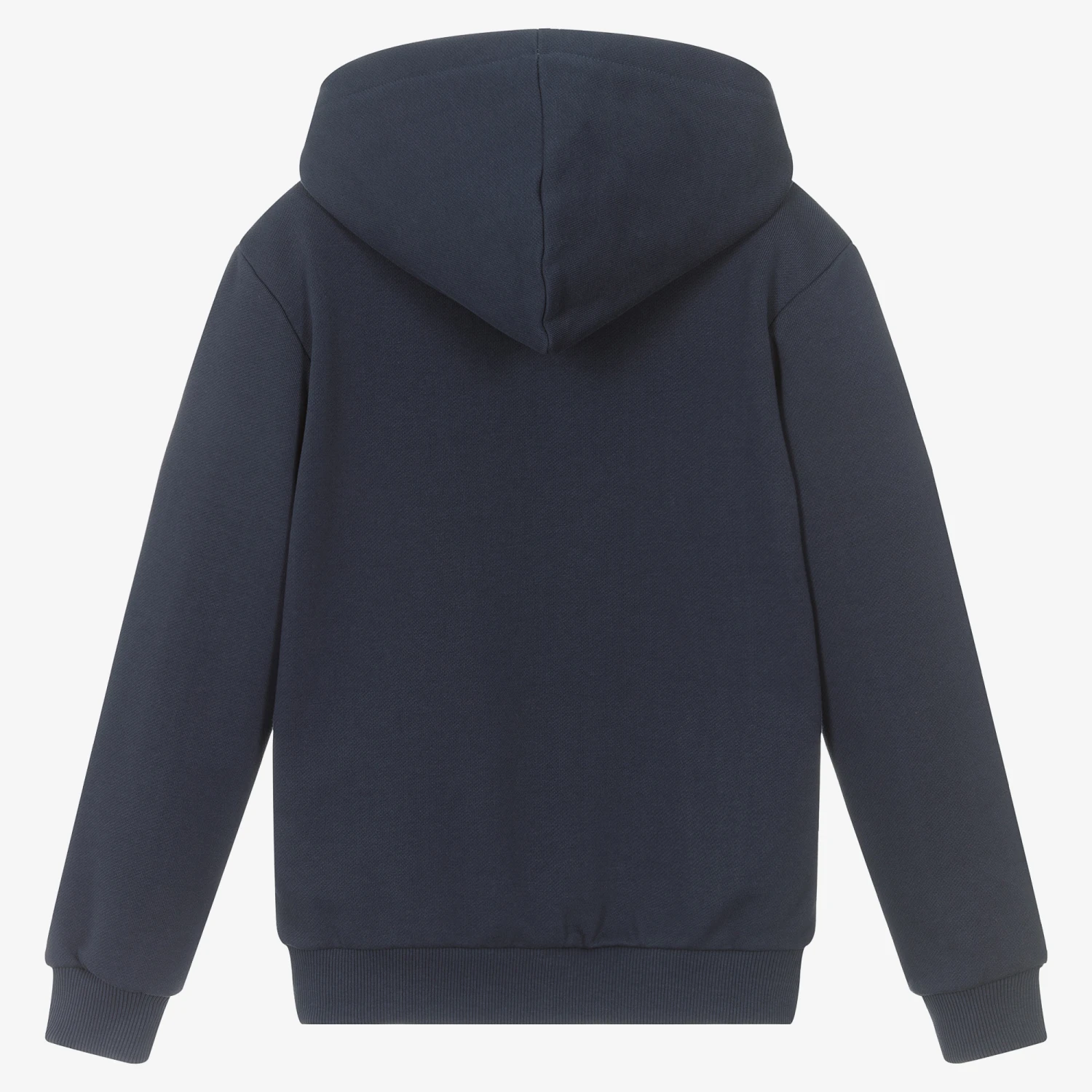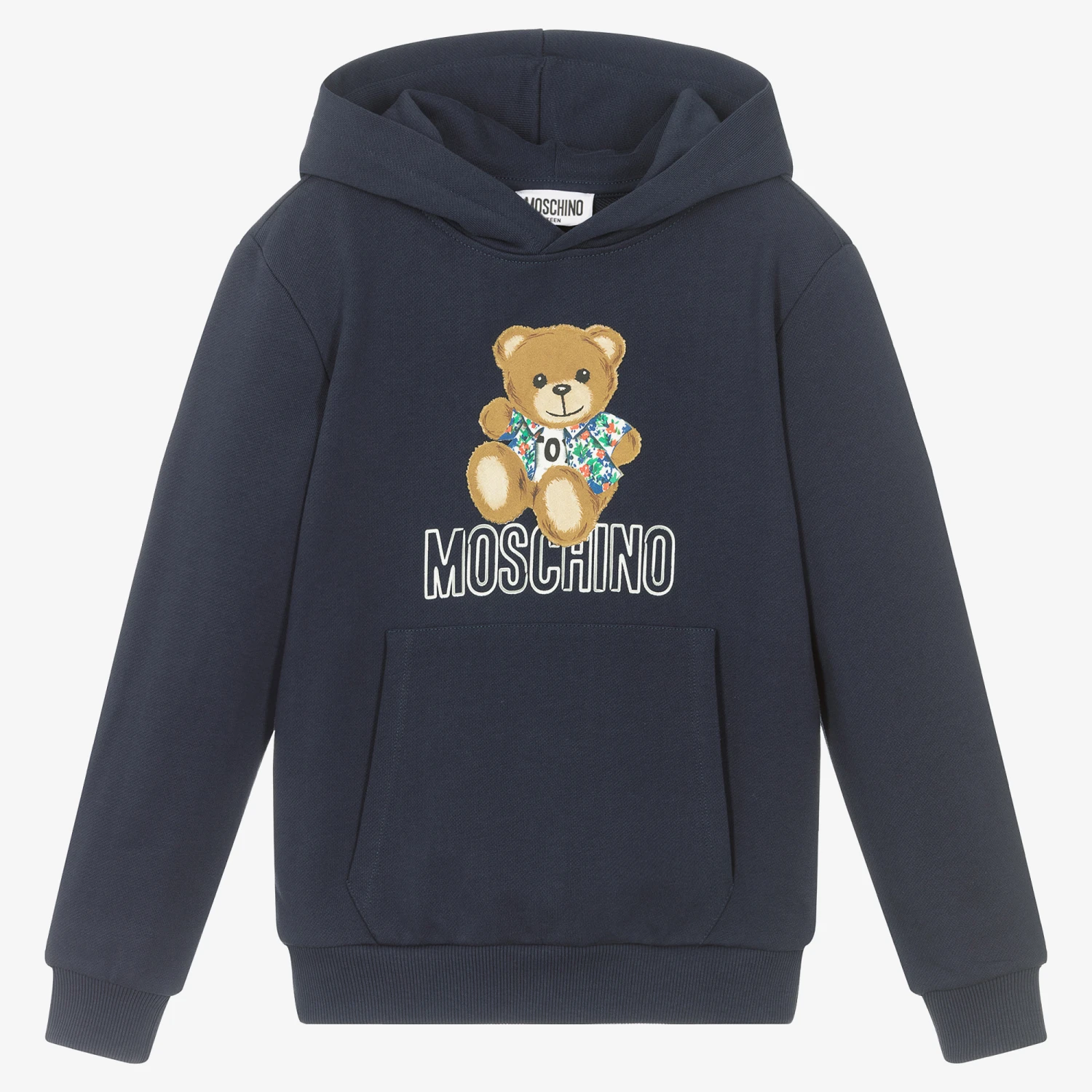 Navy blue cotton hoodie for teen boys unmistakably by luxury Italian designer Moschino Kid-Teen. It has a large, beige Moschino Teddy Bear logo on the front, wearing a colourful, floral shirt. It is made in comfortable jersey with a useful pouch pocket and neat, ribbed trims.