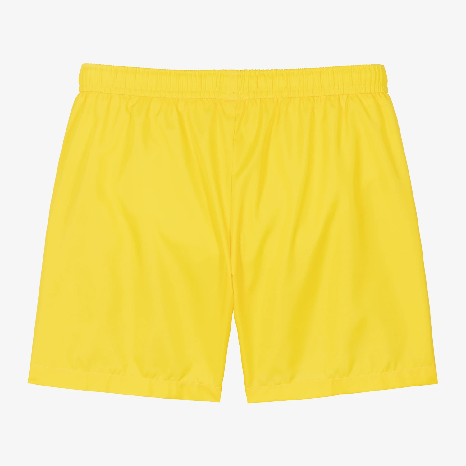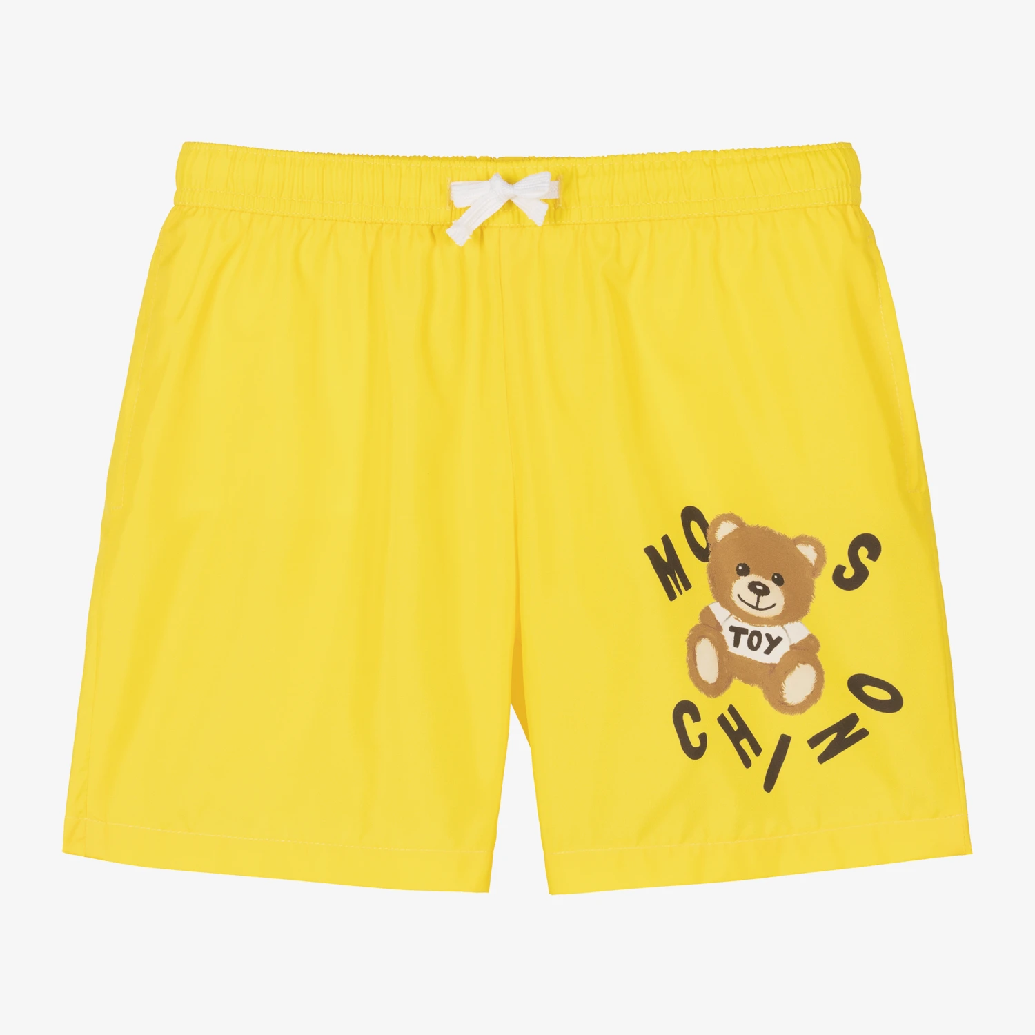 Yellow swim shorts for teen boys by Moschino Kid-Teen, with a brown and white Moschino Teddy Bear logo print on one leg. Silky smooth and lightweight they have a mesh lining for comfort, side seam pockets and a useful drawstring waist.