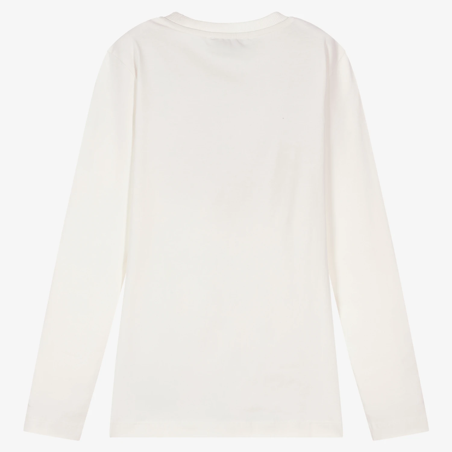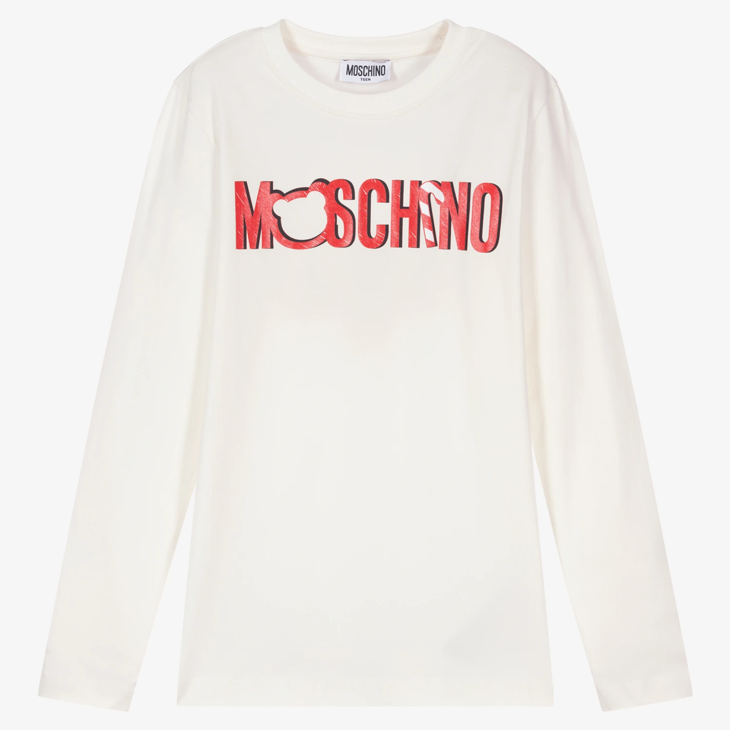 Ivory long-sleeved top for teens by Moschino Kid-Teen. There is a candy cane-themed logo across the front and it is made in soft cotton jersey for easy wearing.