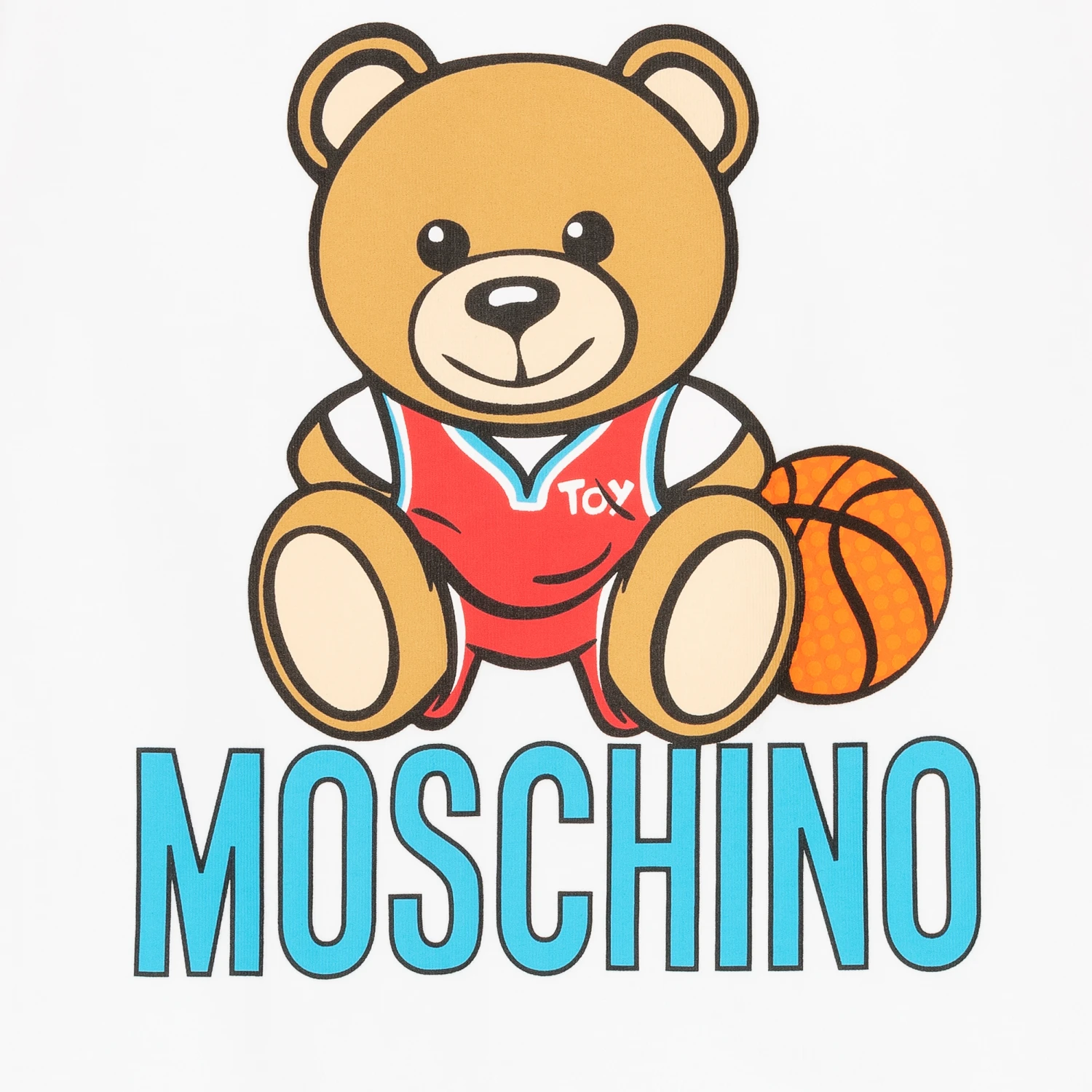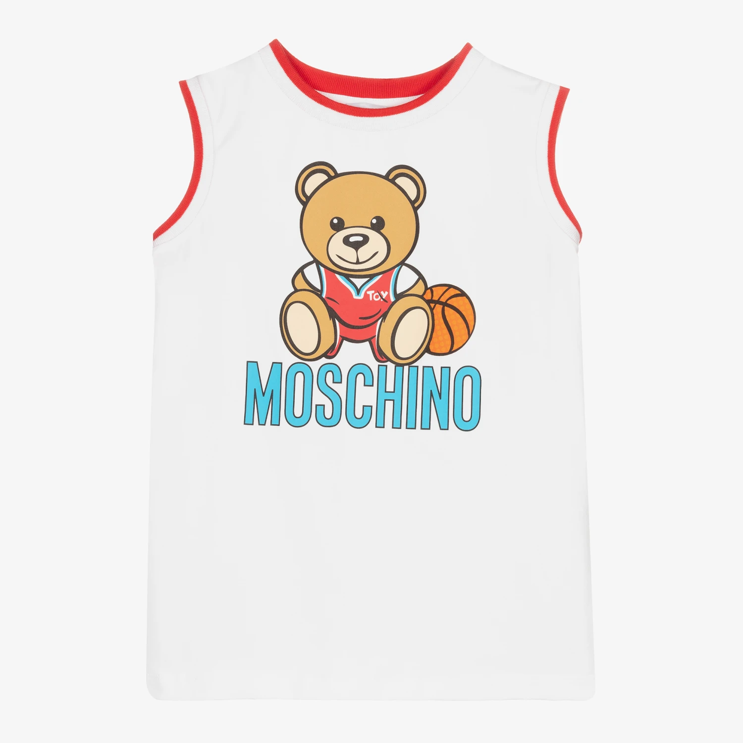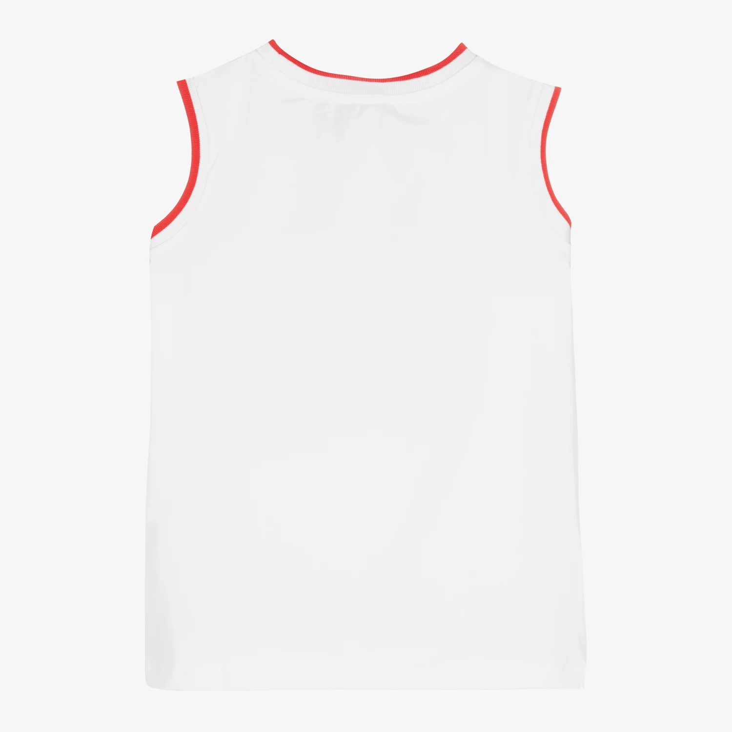 Fun white cotton vest top for teen boys by Moschino Kid-Teen, with red and white trims. It has a fun red, blue and orange Moschino Teddy Bear logo print on the front, in a cool basketball style.