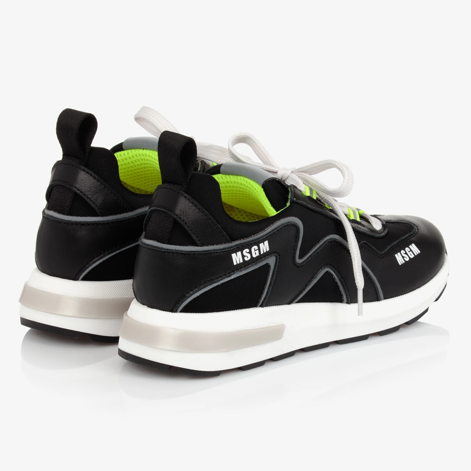 Cool black trainers for teen boys and girls, by MSGM. Made from soft leather and textile, they have white logo prints and stylish neon yellow lace fastenings. They have a chunky white and black rubber sole, and a sporty mesh lining.