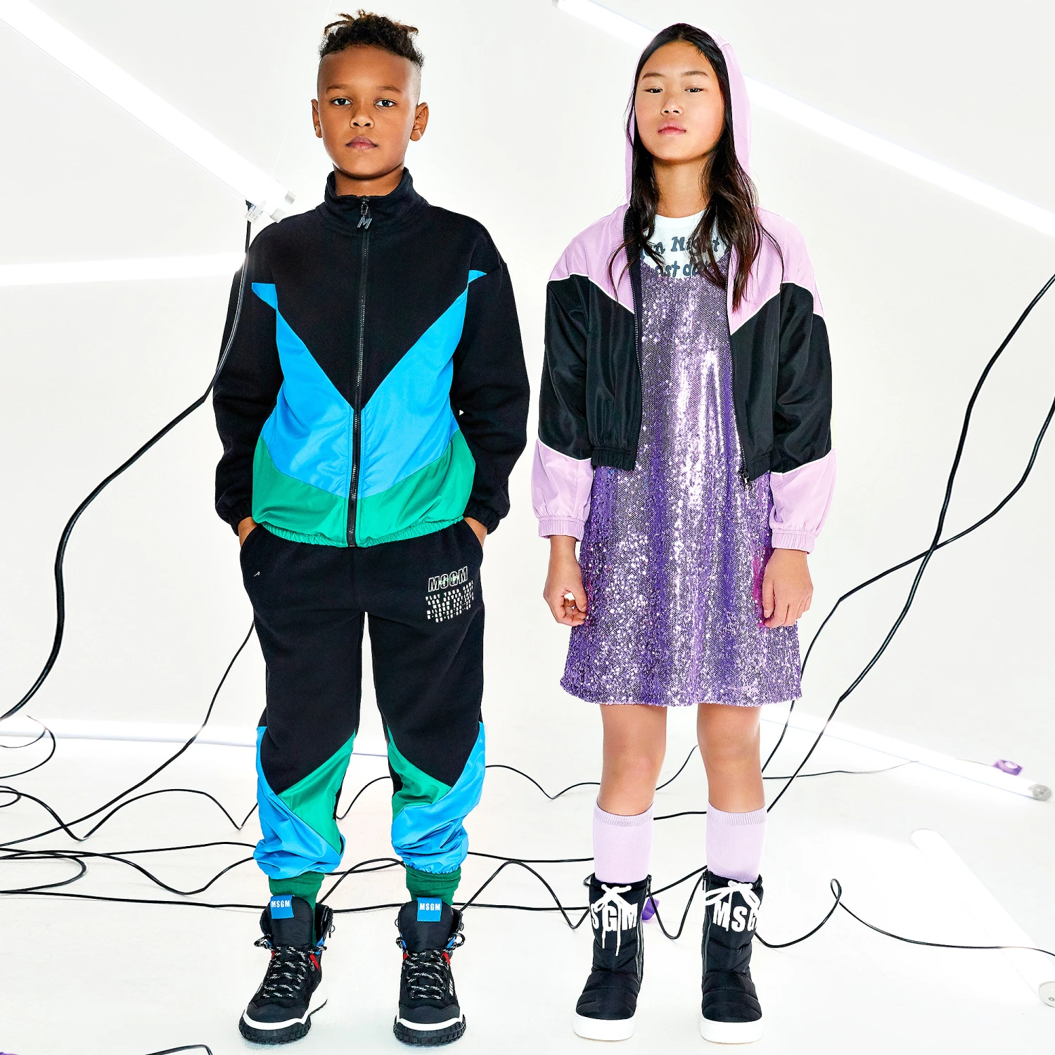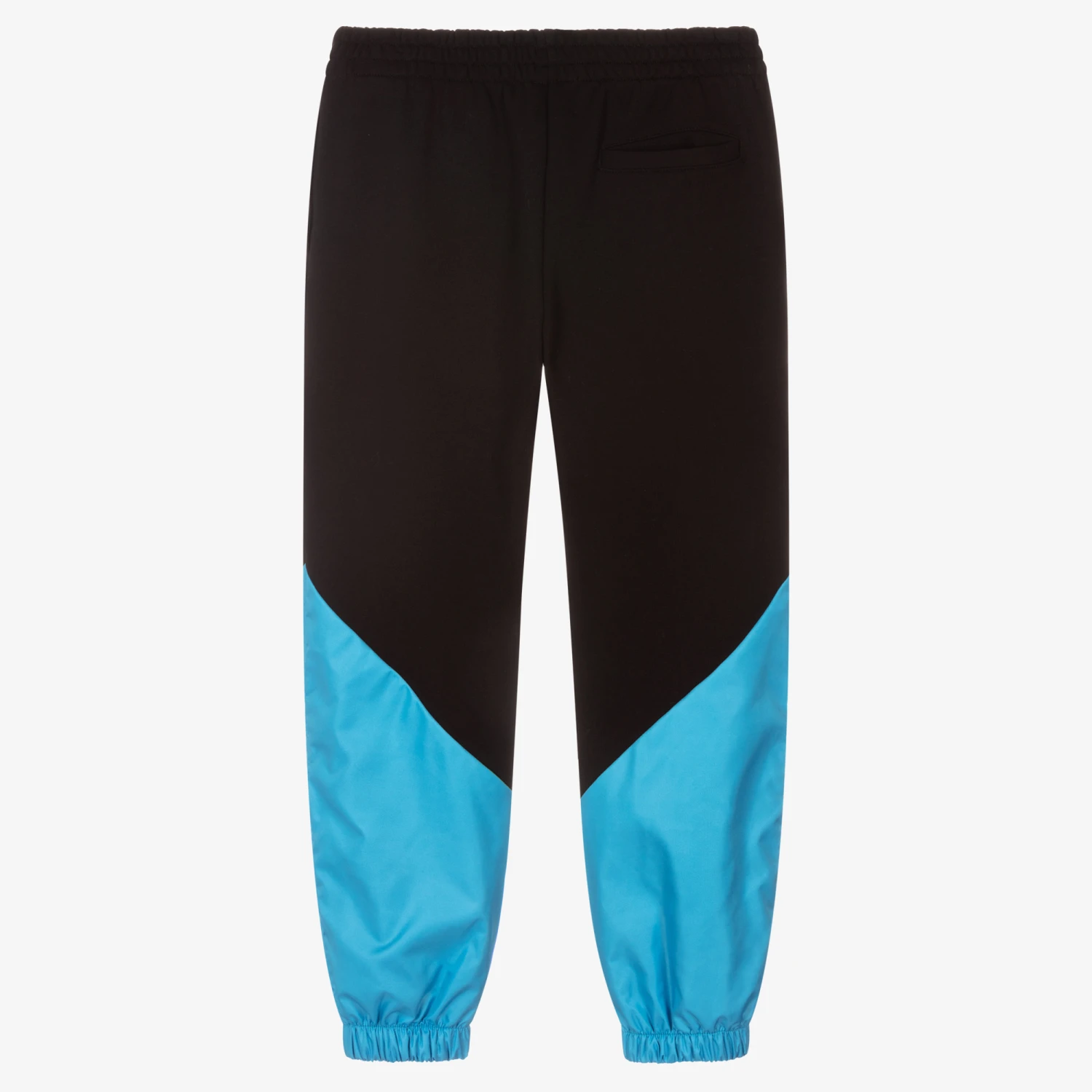 Sporty black joggers for teen boys by Italian brand MSGM, with an Active logo printed on the front in white and green. With silky turquoise blue and green panels on the lower legs, they are made in comfortable cotton jersey with a fleecy inside.