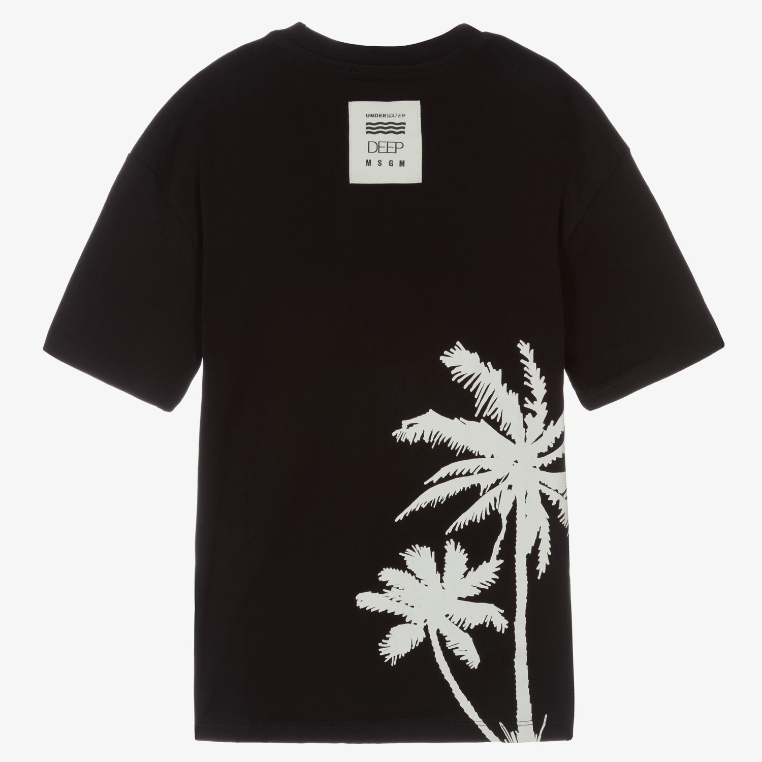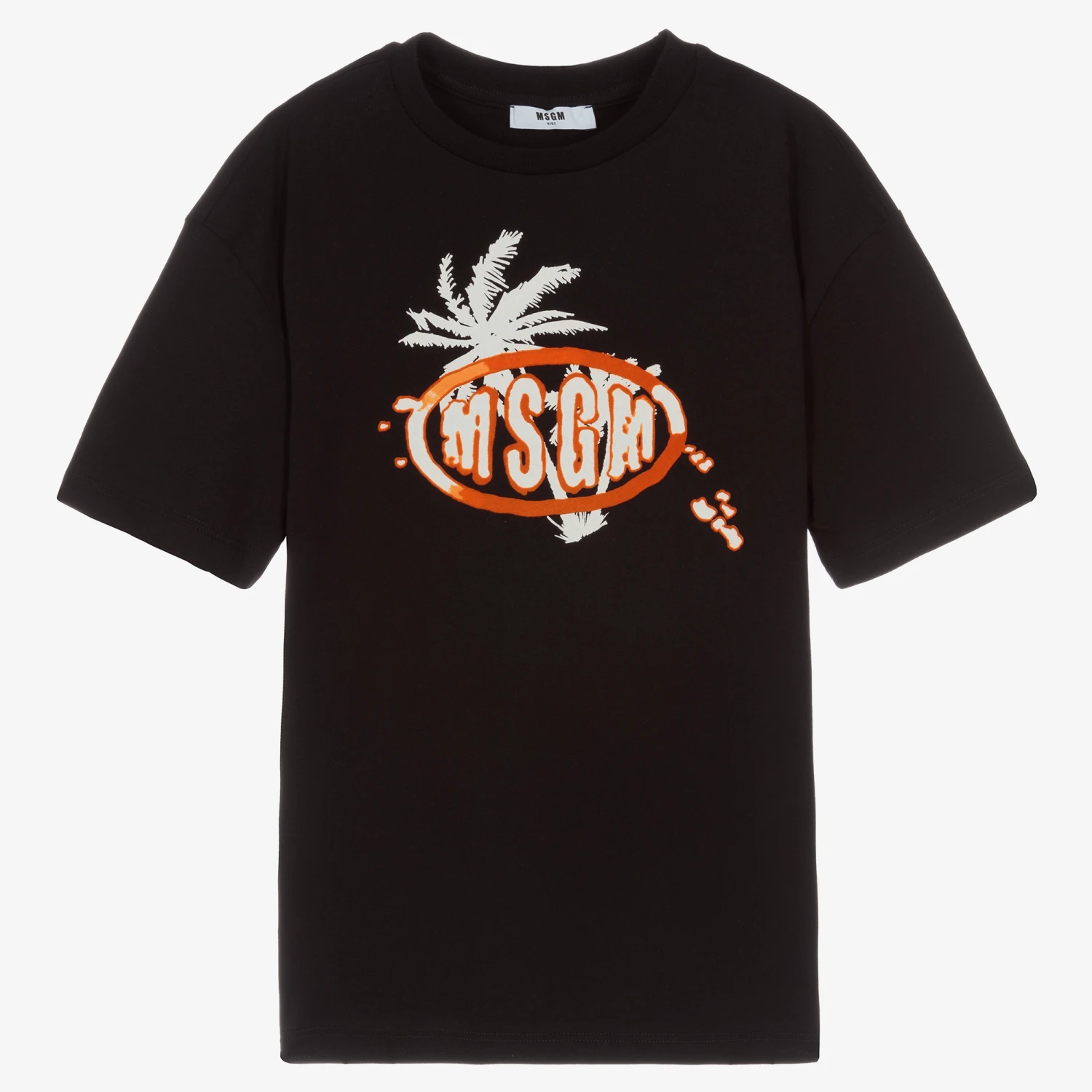 Cool black T-shirt for teen boys from Italian brand MSGM, with an orange, flocked logo over a white palm tree print on the front. The back is printed with silhouettes of palm trees and has a logo patch for an added branded touch. Made in soft cotton jersey, it is casual and comfortable.