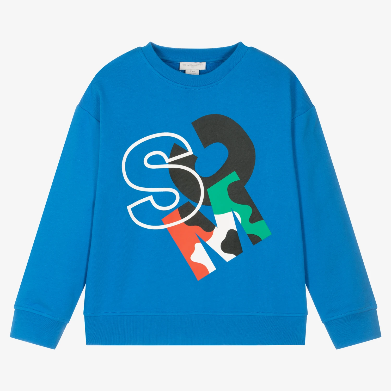 Vibrant blue sweatshirt for teen boys by British brand Stella McCartney Kids, made in mid-weight organic cotton jersey. Providing a pop of colour to any outfit, this cool top has logo initials printed on the front, with a camouflage accent for added interest.