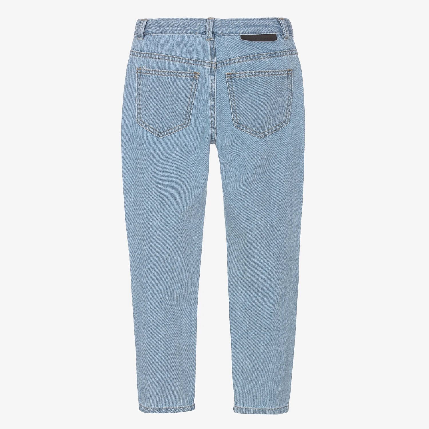Teen boys slim-fit blue jeans by Stella McCartney Kids, made from soft organic cotton denim. Mid-weight, they are slightly tapered with a classic five-pocket design and a branded black patch on the back. There is a useful adjustable waistband, with a zip and clasp fastening for the perfect fit.