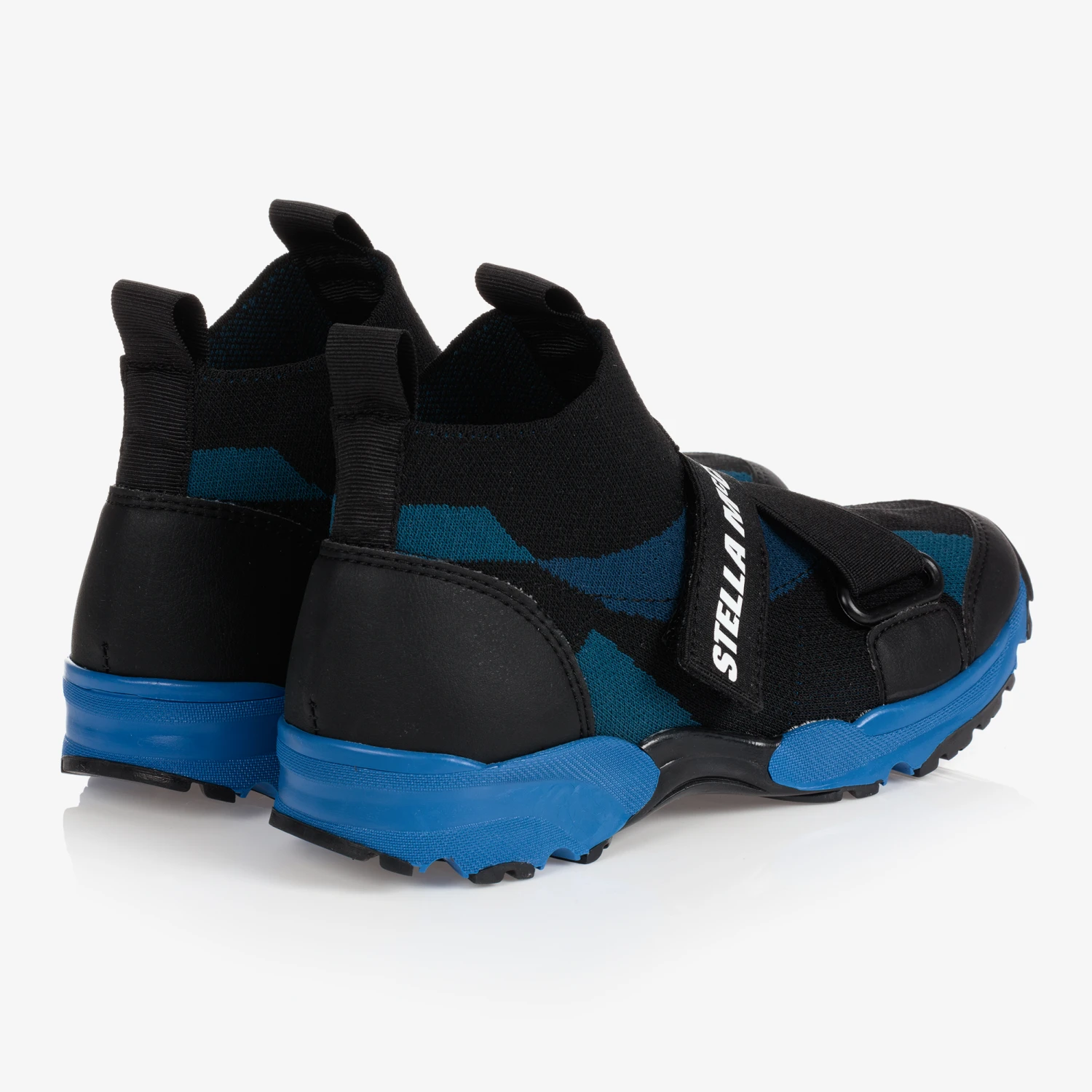 Sporty black and blue fabric sock trainers for teen boys by Stella McCartney Kids. The stretchy jersey upper pulls on like a sock and fastens with a branded elasticated velcro strap for added support. They are trimmed with faux leather for durability and the non-slip rubber soles provide a sure grip.