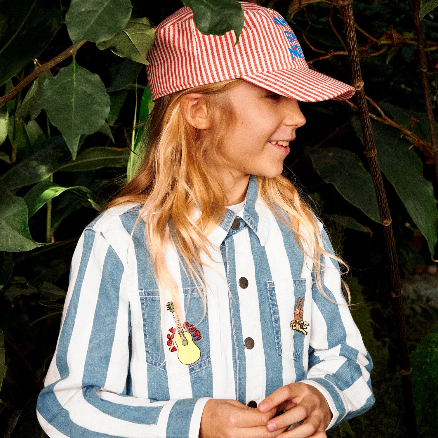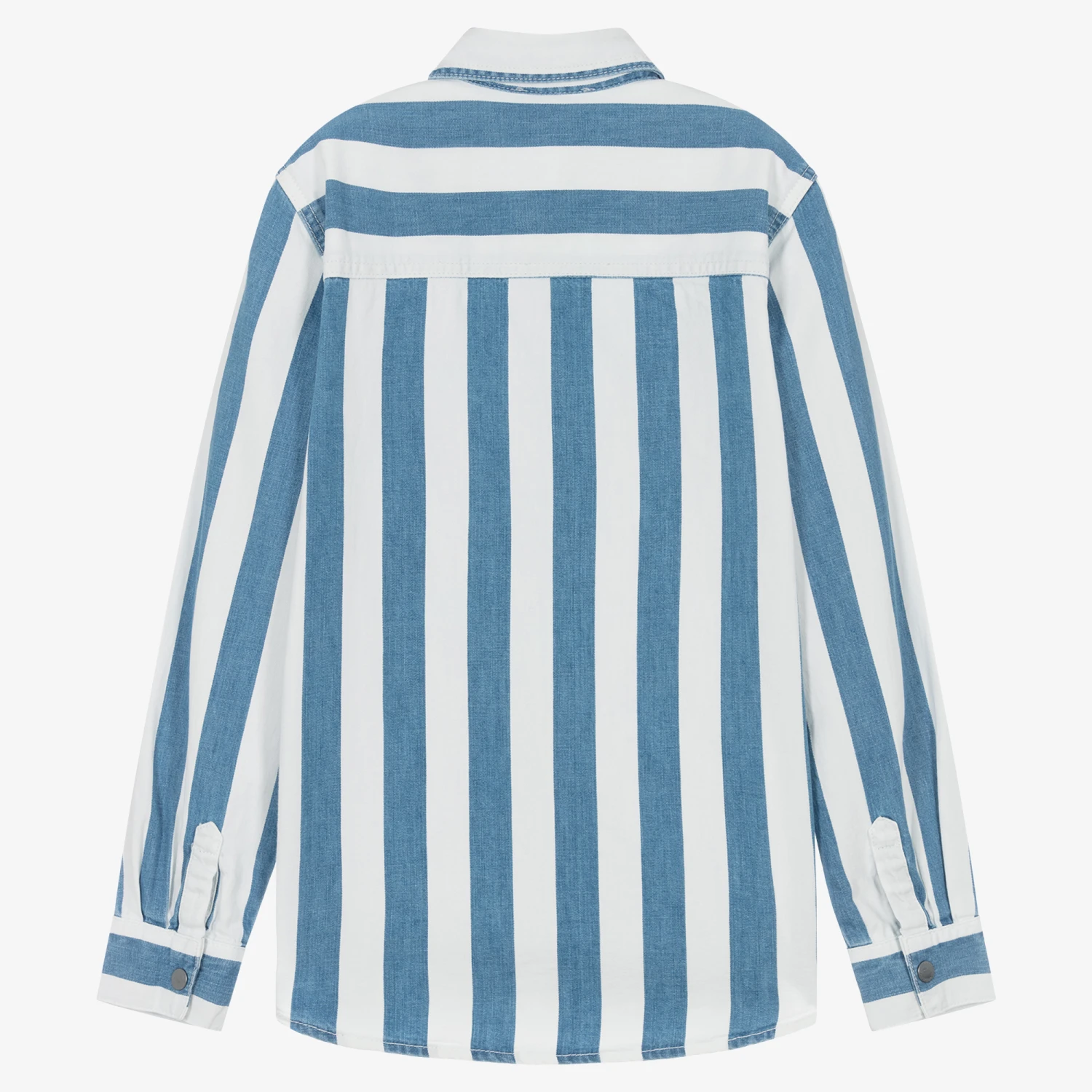 Stella McCartney Kids design this blue and white striped denim shirt, made for teen boys looking for a laid-back look. Cool and colourful stamp appliqués add vibrant pops of colour to this stylish layering piece. Made in soft organic cotton, this eco-conscious style has log embossed poppers on the front and the cuffs for a branded touch. The Stella McCartney fit can be quite small so choose a size up if you want room to grow.