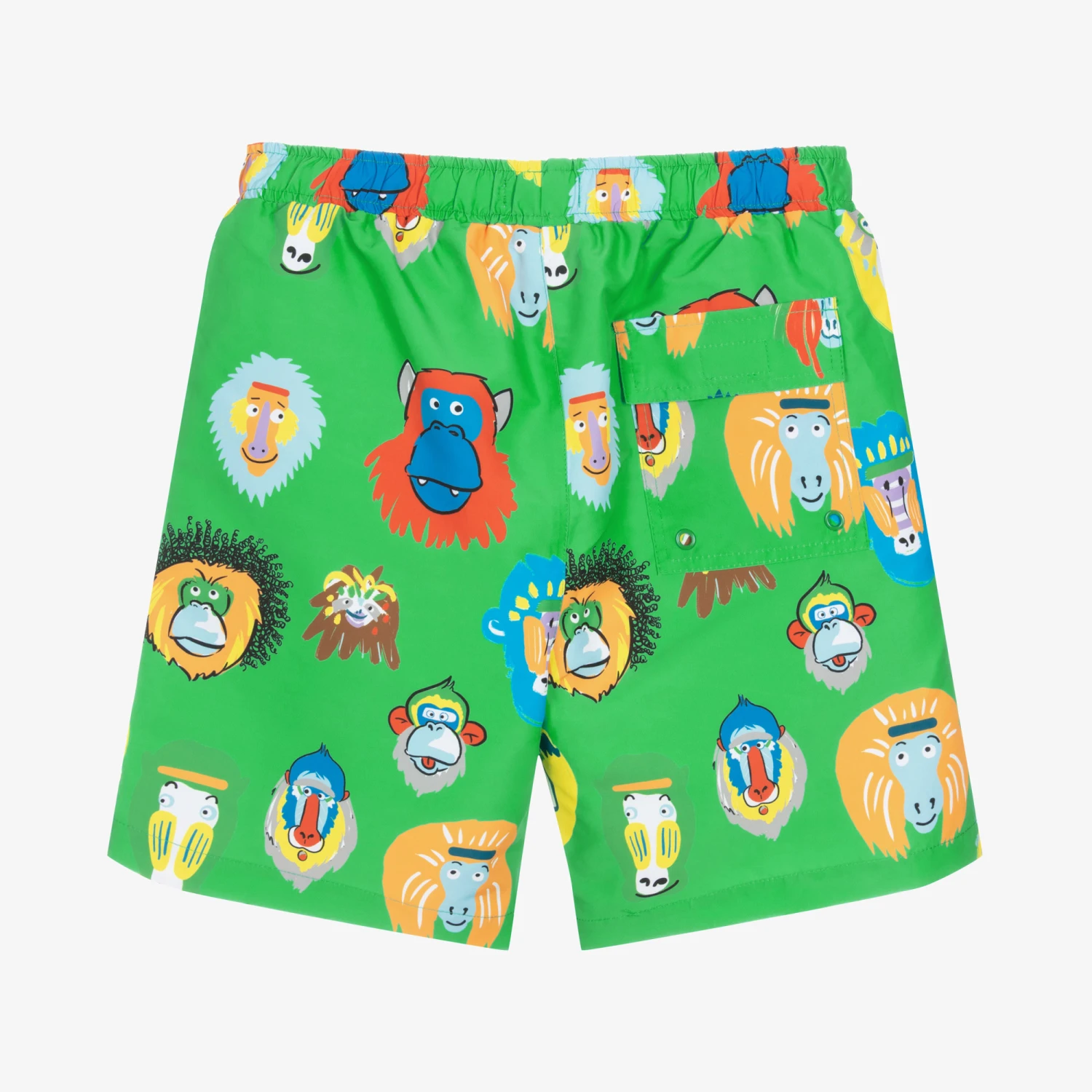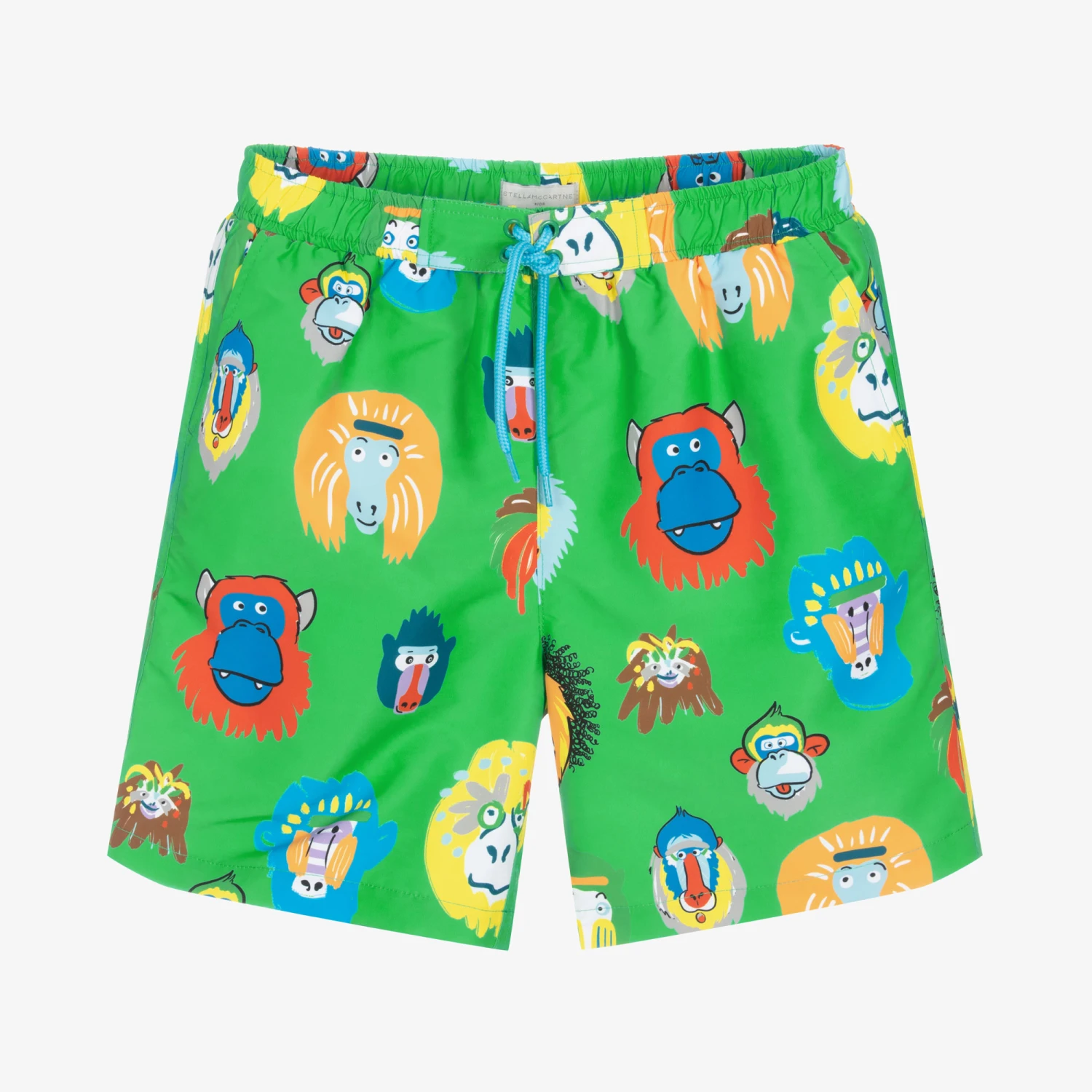 With a colourful monkey print, these silky green swim shorts for teen boys are by Stella McCartney Kids. Made in recycled fibres and lined in soft mesh for comfort, they have jetted front pockets and a velcro-fastening back pocket. They are finished with an elasticated waistband with drawstring detailing.