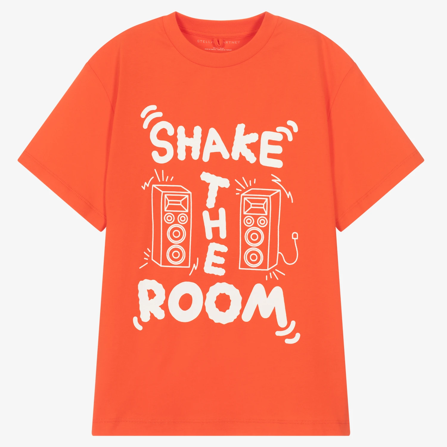 Teen boys red organic cotton T-shirt by British brand Stella McCartney Kids, made in soft, comfortable jersey. With a ribbed, crew neck, the front is printed with fun white speakers and has a ‘Shake the Room’ slogan for a playful finish.