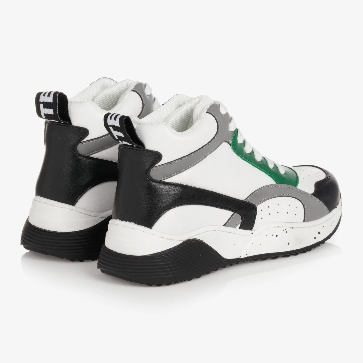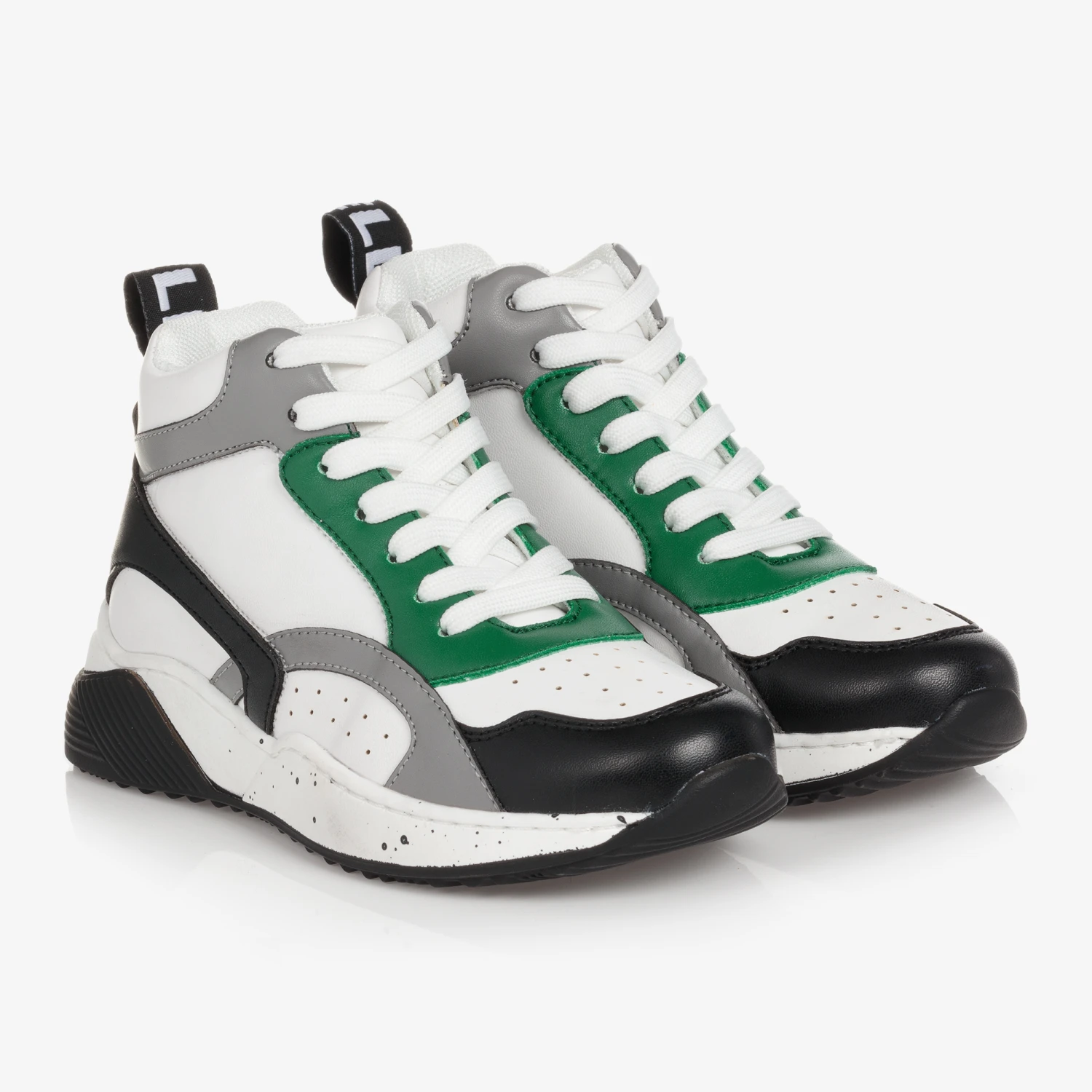 Faux leather high-top trainers for teen boys from Stella McCartney Kids, in a sleek monochromatic style. They are decorated with cool green and grey colourblock trims, with perforated detailing and a bold logo heel-tab. The sole is printed with black paint-effect splatters for edgy creativeness. Fastening neatly with laces, there is a padded textile lining and a non-slip rubber outsole.