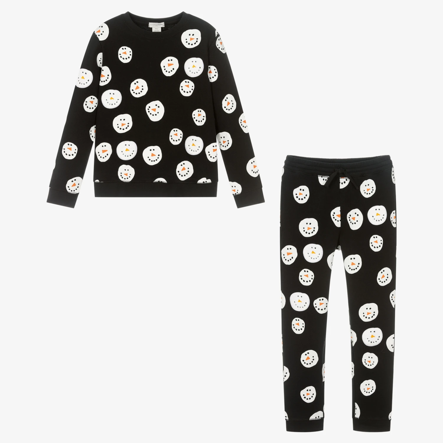 From Stella McCartney Kids, black tracksuit for teen boys and girls with a fun, festive snowman print. Made in eco-friendly organic cotton jersey, both pieces have a fleecy inside for comfort and warmth. The joggers have concealed side pockets and an elasticated waist which can be adjusted with the drawstring for a better fit.