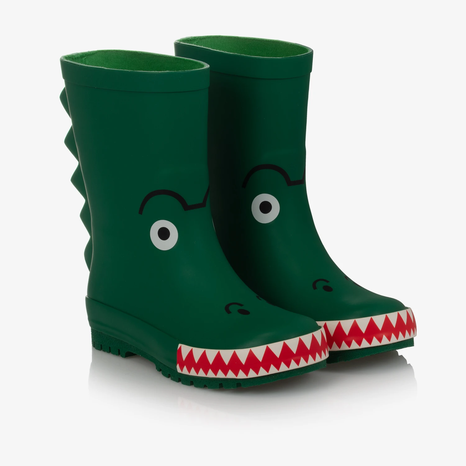 Green rainboots for teen boys from British designer Stella McCartney Kids, made in waterproof rubber. Adding a playful element to wet weather, they have a fun crocodile face print on the front, with a red and white ‘teeth’ trim and 3D spines on the back. They have a textile lining and a cushioned inner sole. The ridged outer sole is made in non-slip rubber.