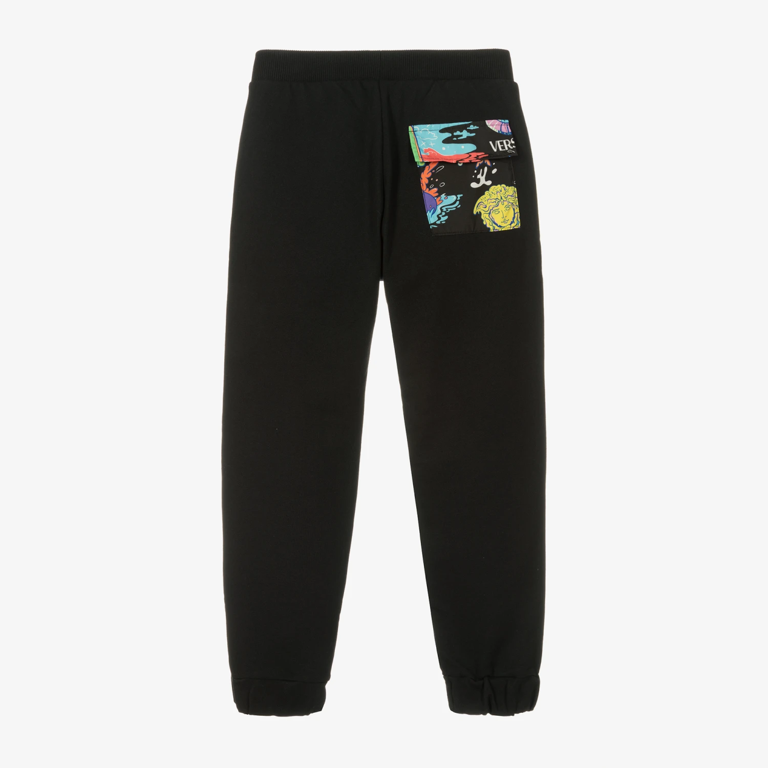Sleek black cotton joggers for teen boys by luxury Italian brand Versace, with a rubberised logo on the front. Made in soft cotton jersey with a looped underside, they have velcro patch pockets on the front and back, both bearing a fun fish print with subtle Medusa detailing. There is a decorative tied knot on the front of the elasticated waist.