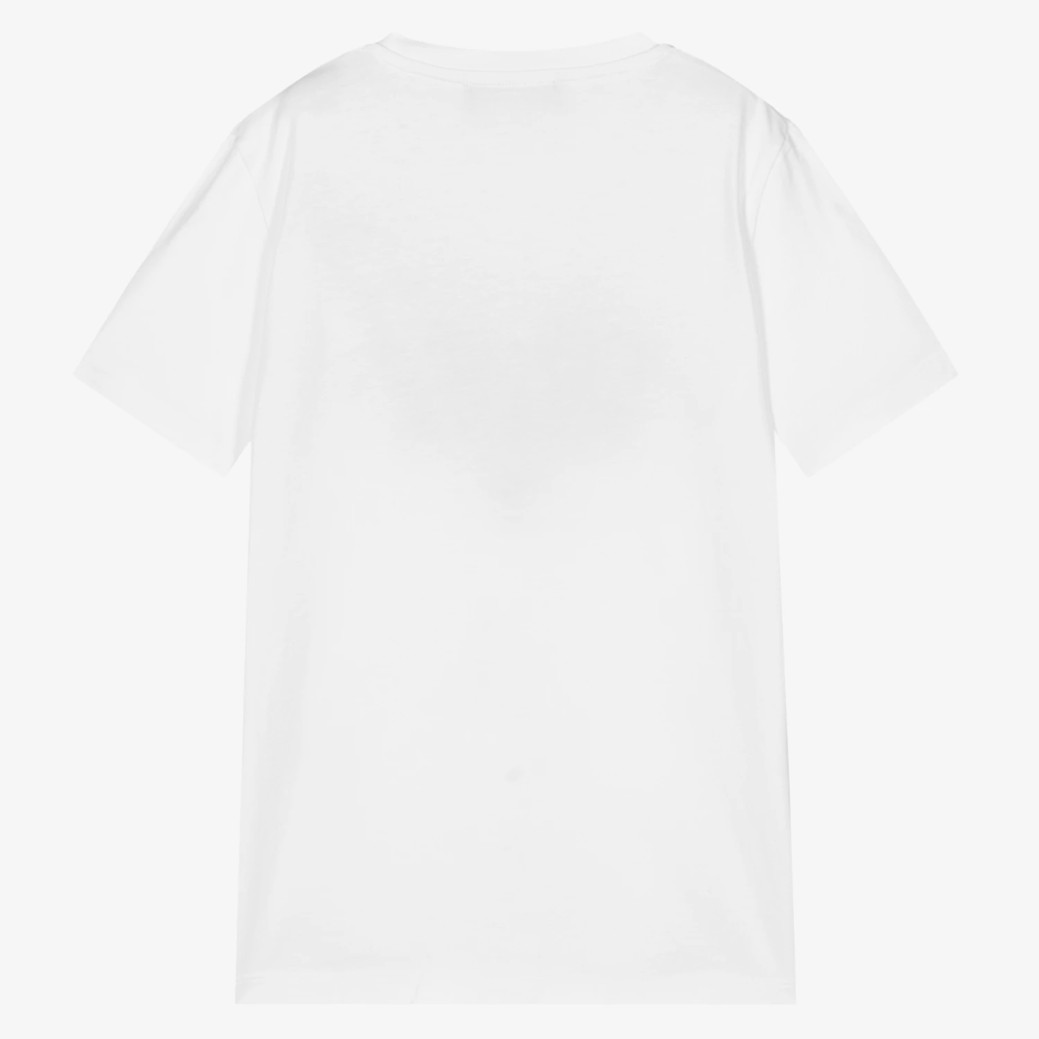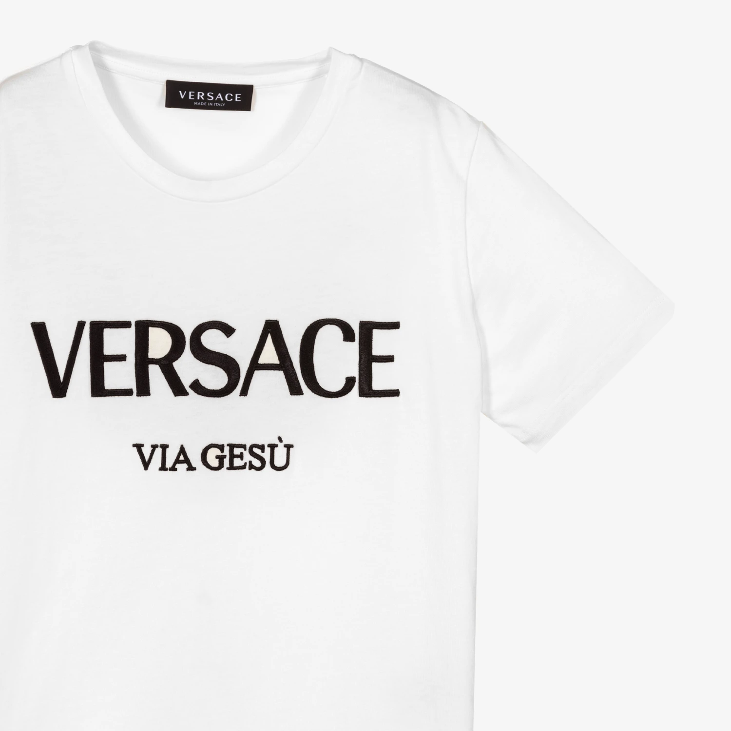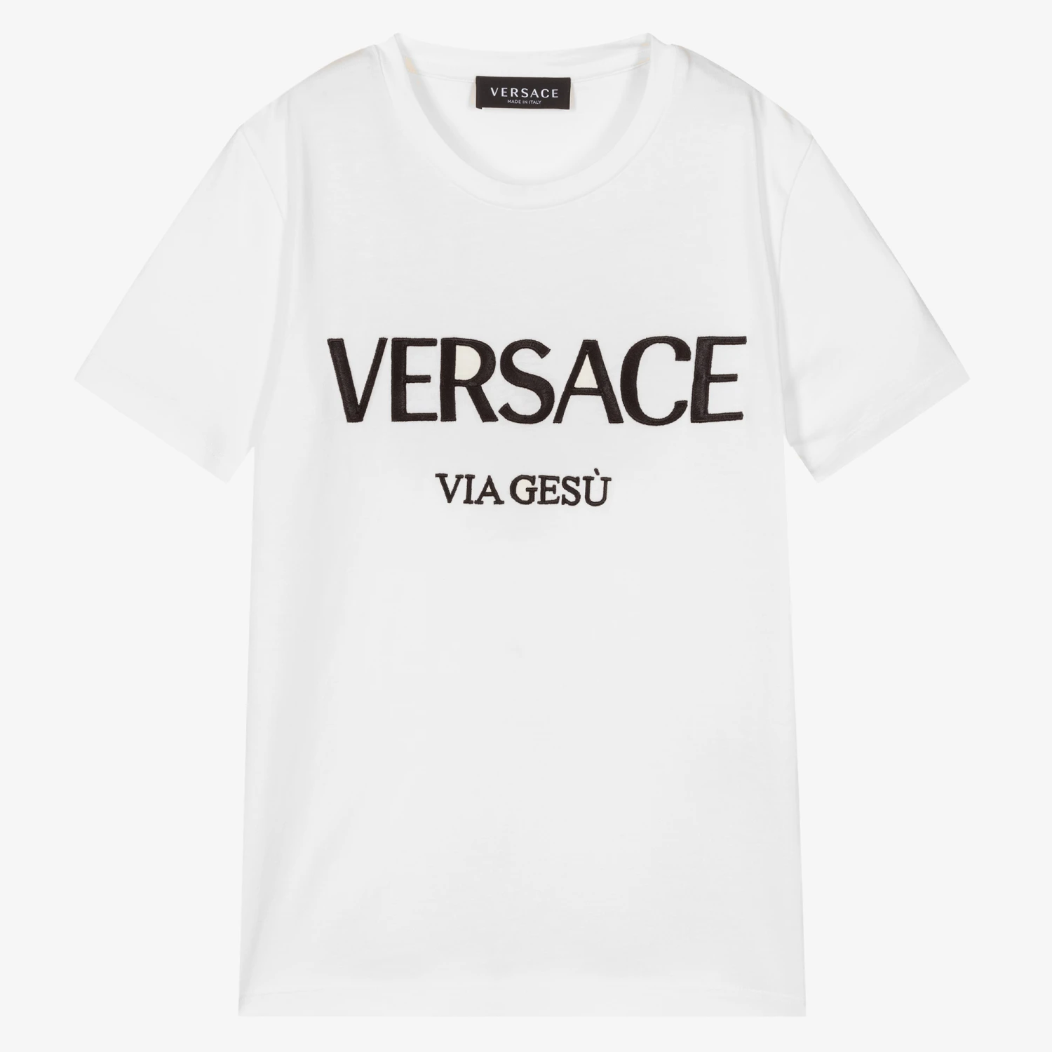 Wardrobe staple white T-shirt for teen boys by luxury Italian designer Versace, made in soft cotton jersey. It has a contrast black embroidered logo on the front.