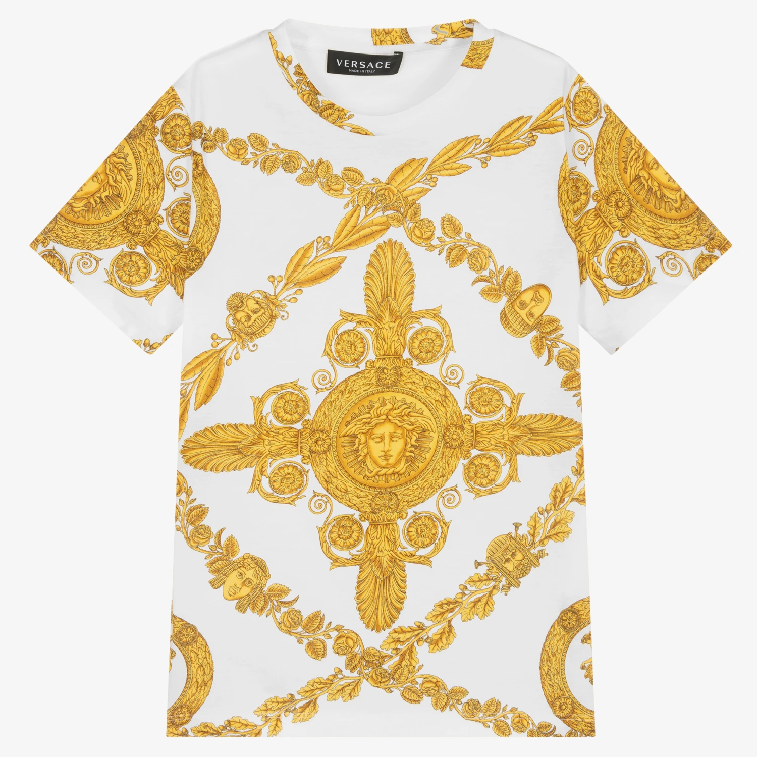 A distinctive white and gold T-shirt for teen boys by luxury label Versace, designed in the signature Barocco print. Representing the Italian heritage, this crew neck T-shirt features the iconic Medusa logo for an original Versace look.